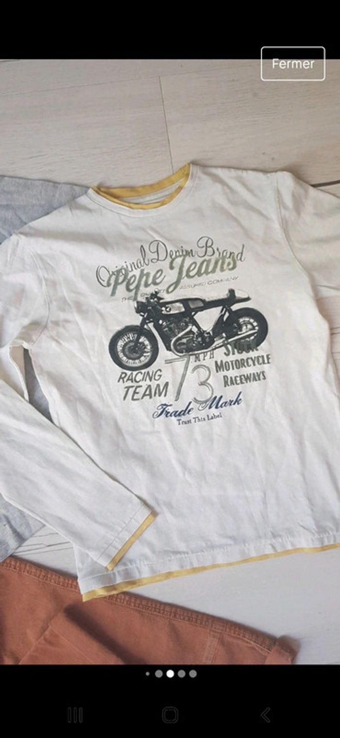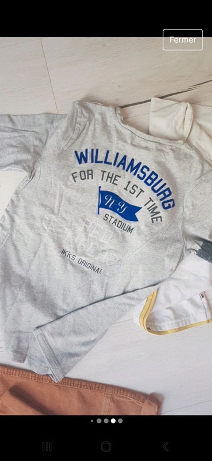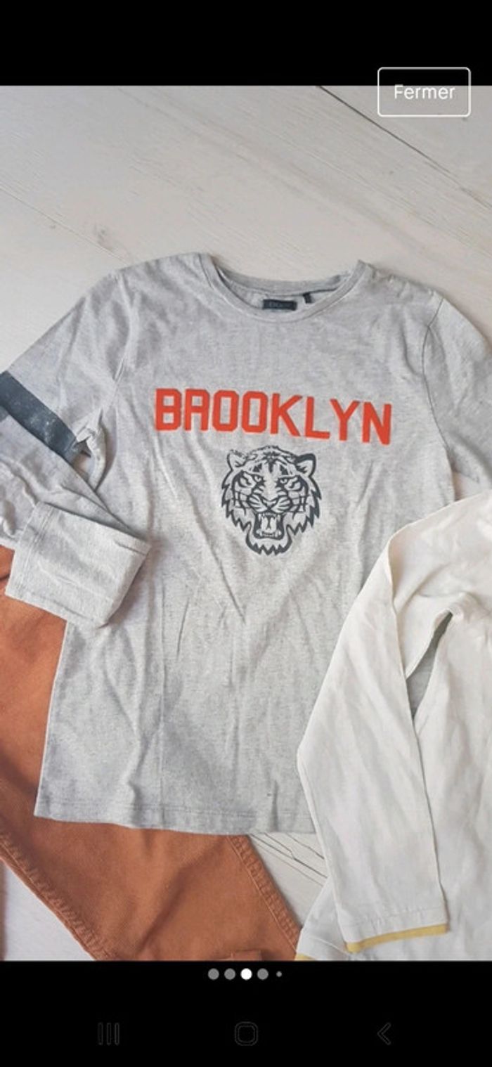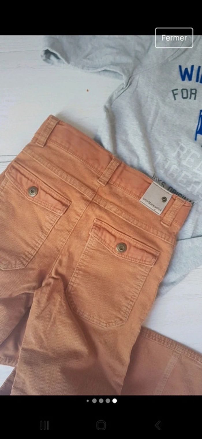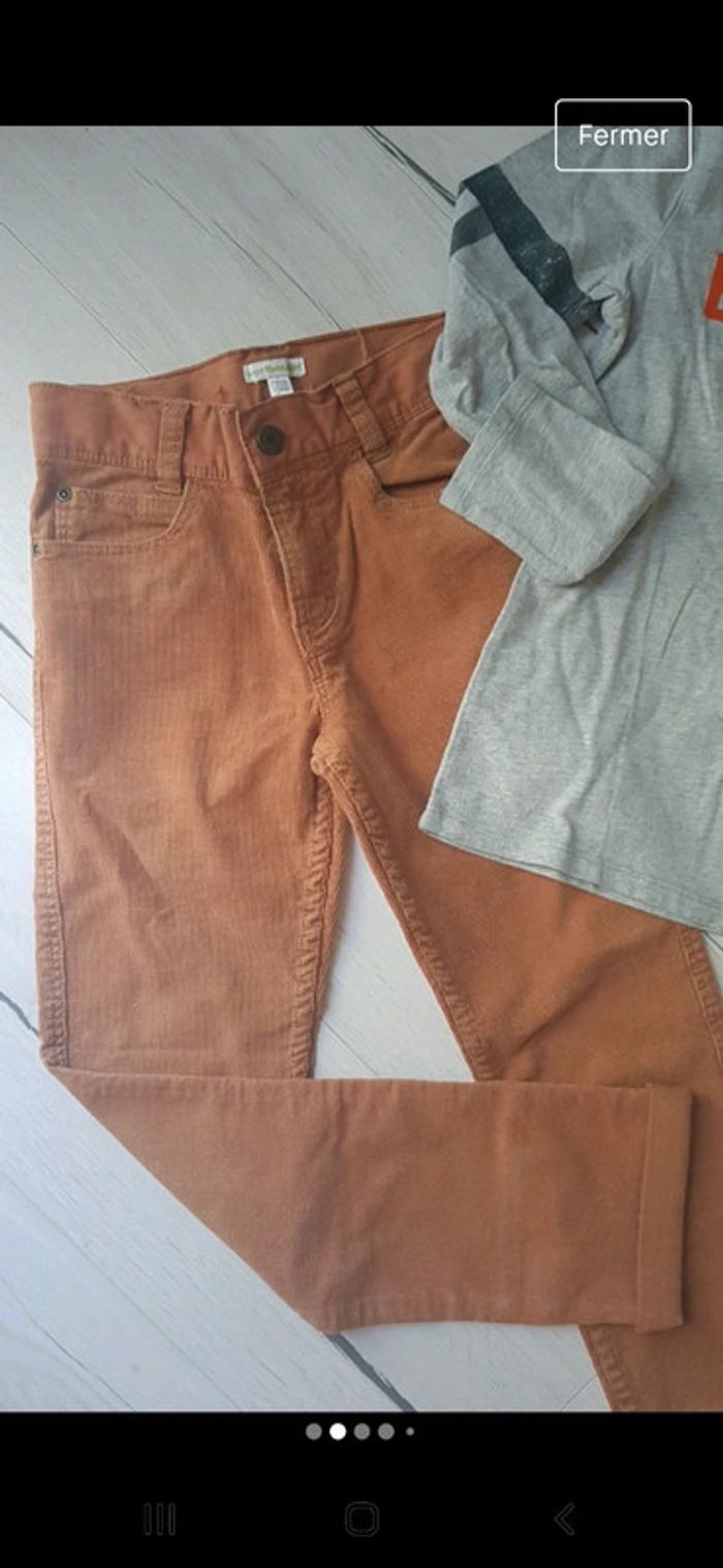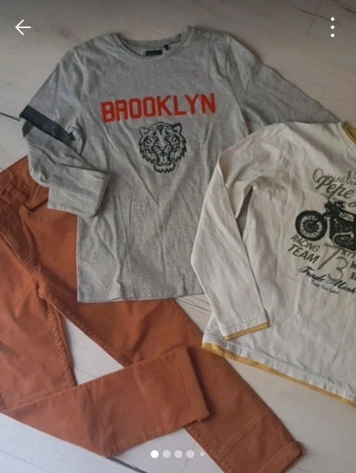Superbe lot en excellent état. Pantalon vertbaudet velours camel. Tee shirt ikks gris motifs recto verso. Tee shirt blanc pepe jeans. #10anstristan #jeanslim #ikks #teeshirts #vertbaudet #pepejeans #ensemble #camel
