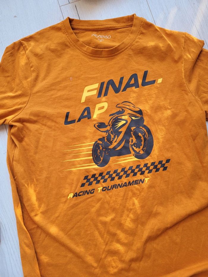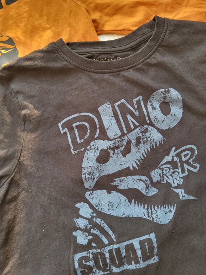 Lot de 2 tee shirts 14 ans manches longues garçon. In extenso. Un orange motif moto neuf. Un noir dinosaure porté 1 fois. #14anstristan #teeshirt #14ans #garçon #inextenso #dinosaure #moto