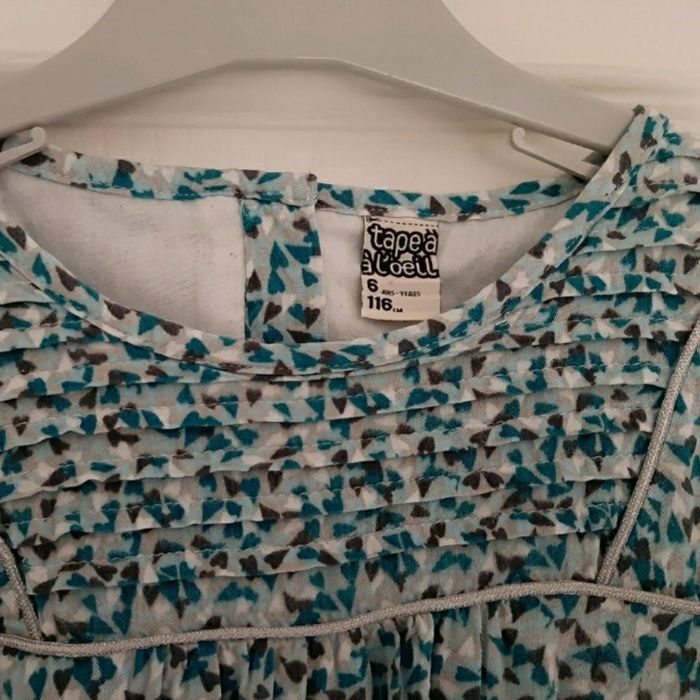 Très jolie robe à manches longues, entièrement doublée, motif petits coeurs bleus/gris/blancs, liseret argenté près du col. Resserrée à la taille, 2 poches, élastique aux poignets. Bien portée mais reste en très bon état. Tape à l'œil, 6 ans.