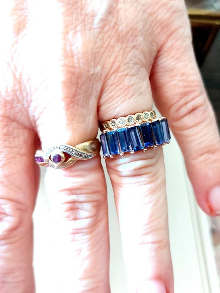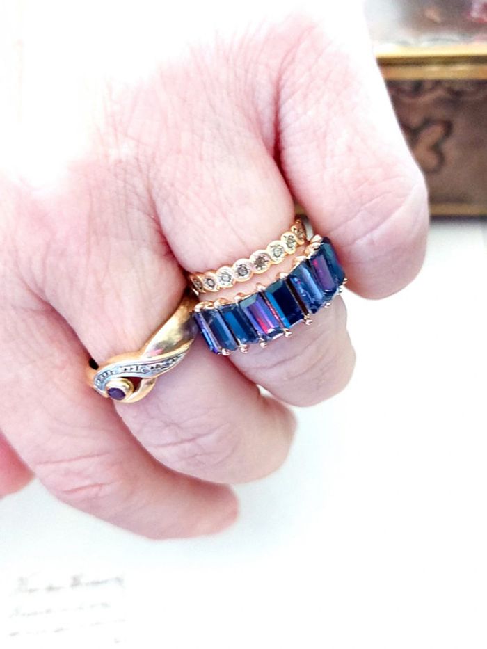 Magnifique bague doré, alliance avec pierres rectangulaire couleur violette. Très bon état. Taille 52. D'autres bijoux sont à découvrir dans mon dressing #bijouxsupernova 🌌 Je suis disponible pour d'autres renseignements / ou demandes de lot. 🌌 Les envois se font soit le jour même ou en 72h maxi ! 🌌 J'accepte les offres raisonnables et les réductions sont activées sur les lots, de plus, un petit cadeau est toujours rajouté au colis. Tags Vintage chic hippie 60's 70's 80's 90's 00's Y2k foulard soie collier bijoux fantaisie signature boucles d'oreilles bague bracelet manchette jonc parure pendentif médaille religieux ancien brocante antiguo antico juwelen bigiotteria joyería antigua antique antik vieux victorien belle époque 1920 art déco art nouveau 1930 années 50 lot gros lot lotto set carré friperie poinçon pièce rare argenté doré bronze perles strass