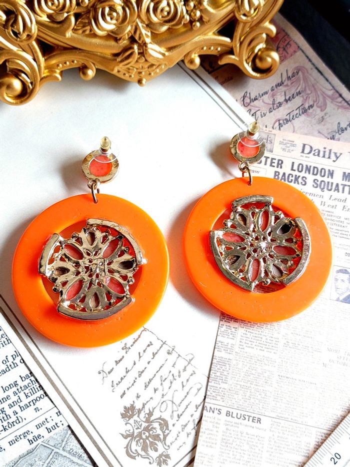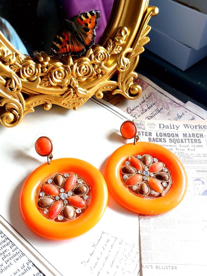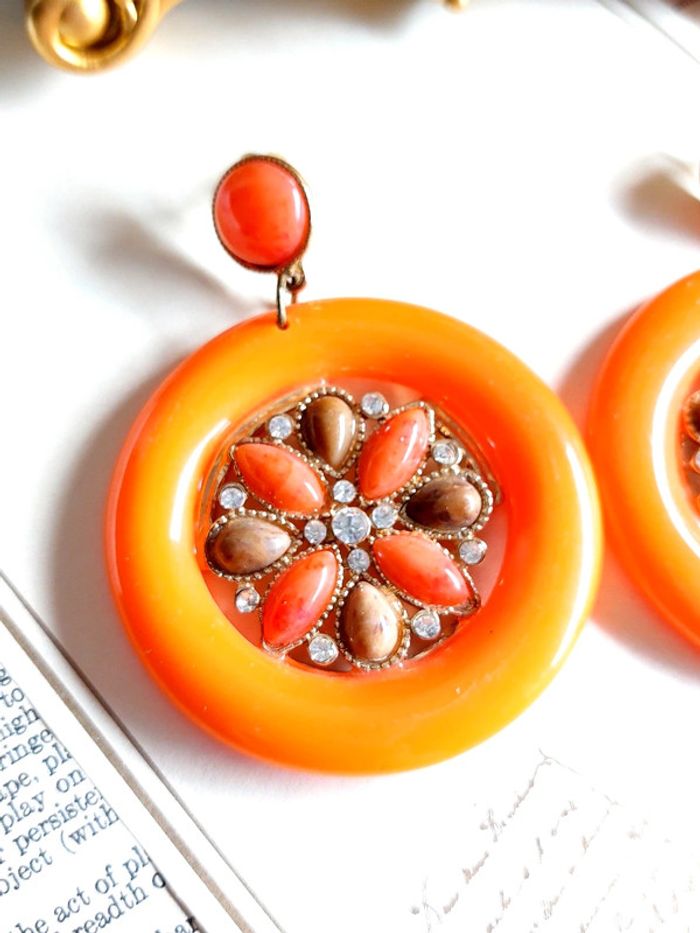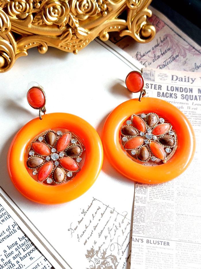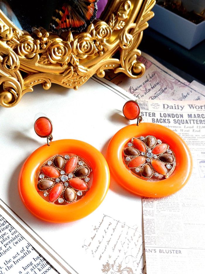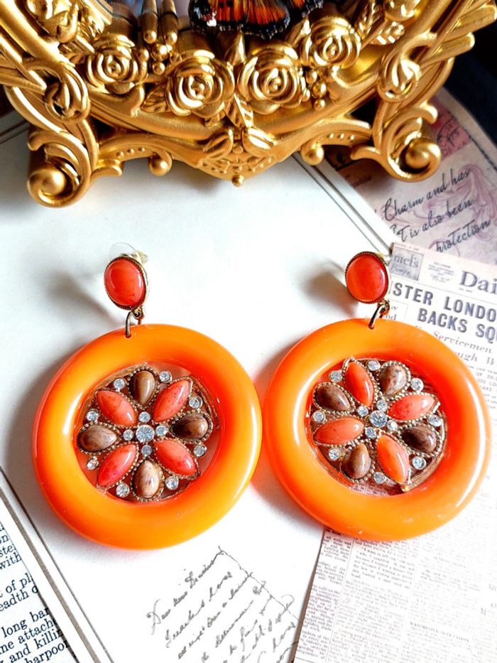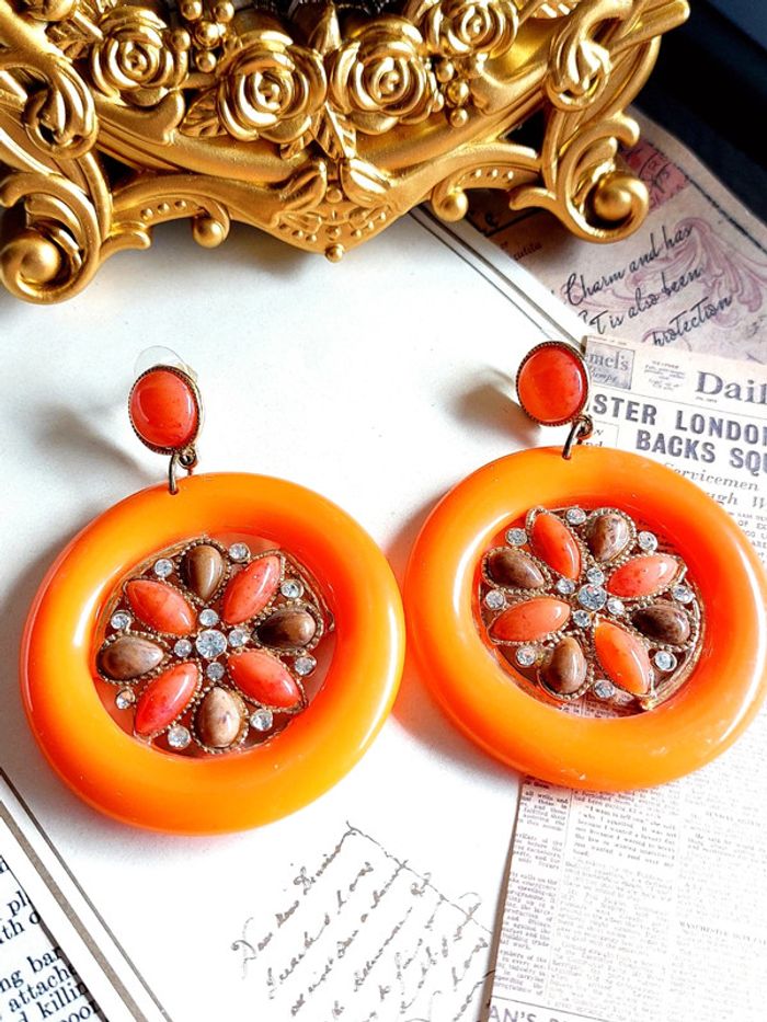 Magnifique paire de boucles d'oreilles pendantes style vintage, orange avec strass. Très bon état. En plastique. D'autres bijoux sont à découvrir dans mon dressing #bijouxsupernova 🌌 Je suis disponible pour d'autres renseignements / ou demandes de lot. 🌌 Les envois se font soit le jour même ou en 72h maxi ! 🌌 J'accepte les offres raisonnables et les réductions sont activées sur les lots, de plus, un petit cadeau est toujours rajouté au colis. Tags Mode vintage chic hippie 60's 70's 80's 90's BCBG robe chemise pantalon jupe classe bijoux boucles d'oreilles collier pendentif bracelet celtique ethnique bohème ésotérique gothique punk grunge old school geek ancien brocante friperies france Paris parisienne qualité couture tournesol marilyn Monroe astro cosmétiques produits de beauté tissu japon breloque acier inoxydable plaqué or automne hiver printemps été Noël cadeau lune moon child fleurs petit prix réduction lot chouchou scrunchie rétro kawaii japon t-shirt débardeur tunique blouse chemisier camisa camicia vestido vestito pantalones remise lotes jurk Flores brillant coton polyester satin soie jeans elastane sexy élégant pièce rare rome Madrid multicolore noir blanc rouge bleu jaune vert rose orange violet marron pas cher soldes 50% unique look outfit tenue complète conjunto