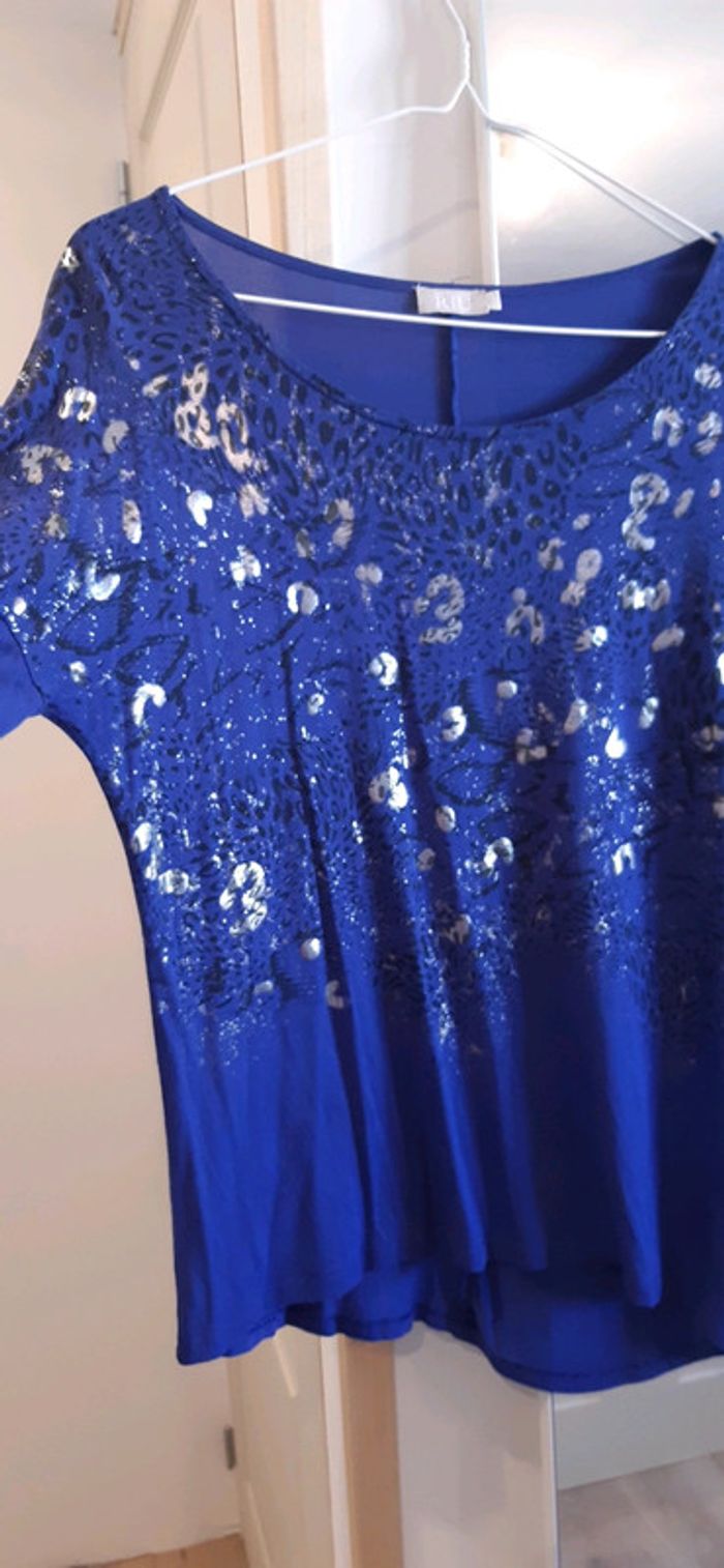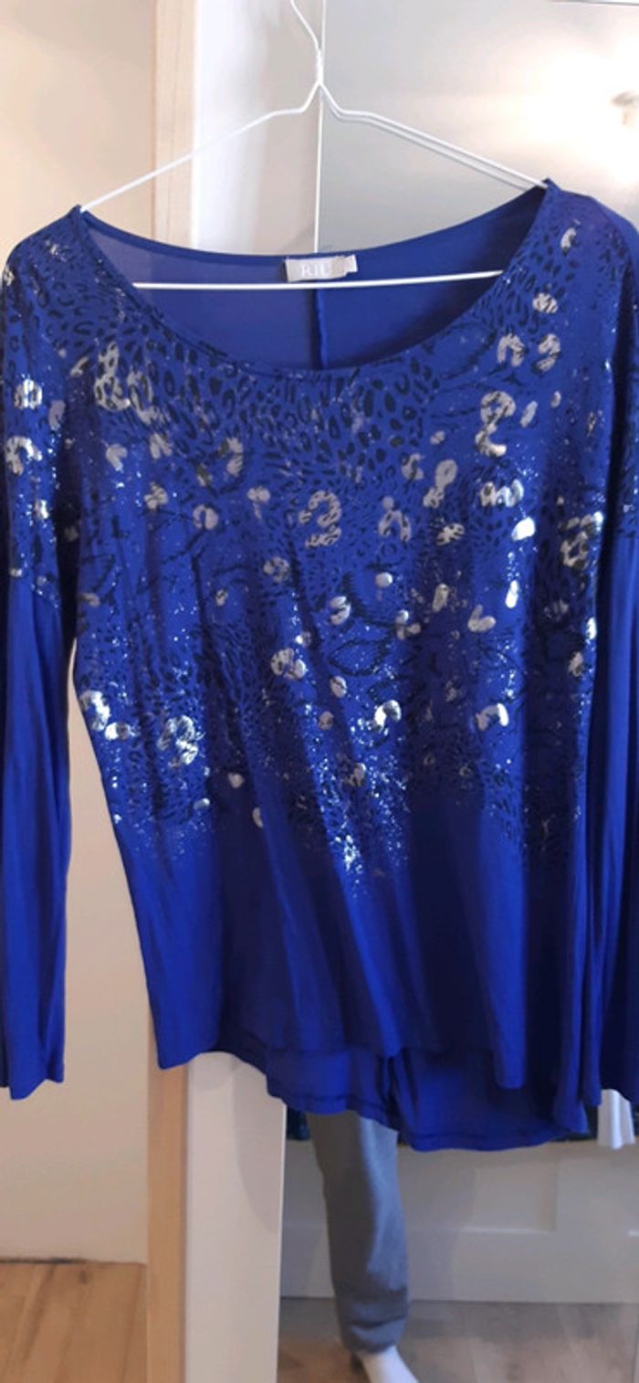 Magnifique Haut manche longue Bleu roi motif léopard noir et argenté Bas asymétrique un coté un peu long que l autre Composition : coton elasthane #femme38Mcelinech