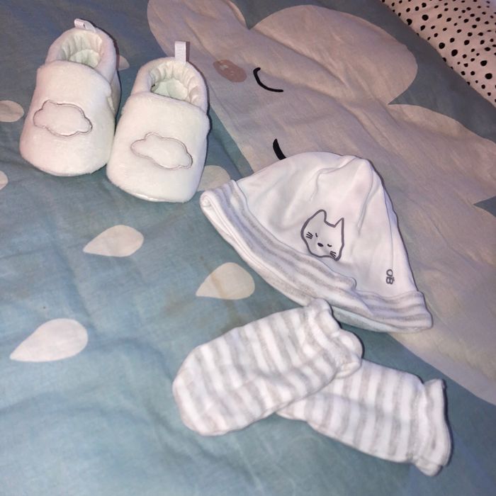 Très bon etat Bonnet et gant obaibi seul le bonnet a été porté 1 fois Chausson kiabi neuf