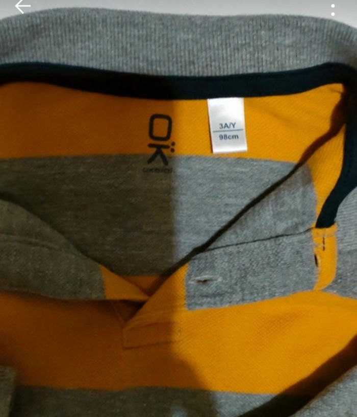 Polo manches longues, couleur gris et jaune moutarde, taille 3 ans, marque Okaïdi, bon état, pas de traces d'usure