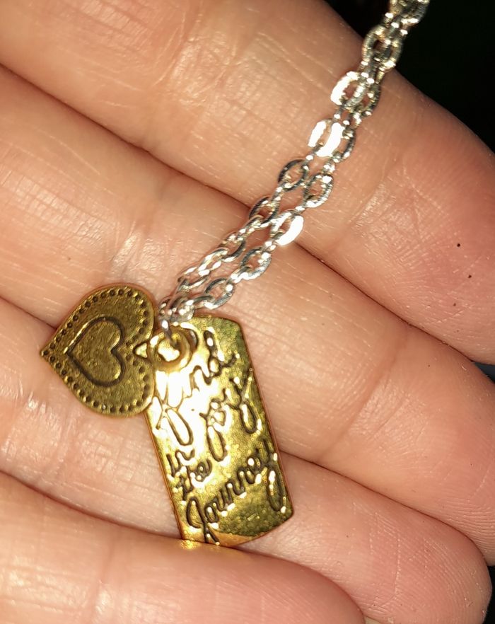 "Trouve de la joie dans la journée " inscrit sur le pendentif et un cœur est en pendentif aussi. Chaine et pendentif en acier inoxydable.