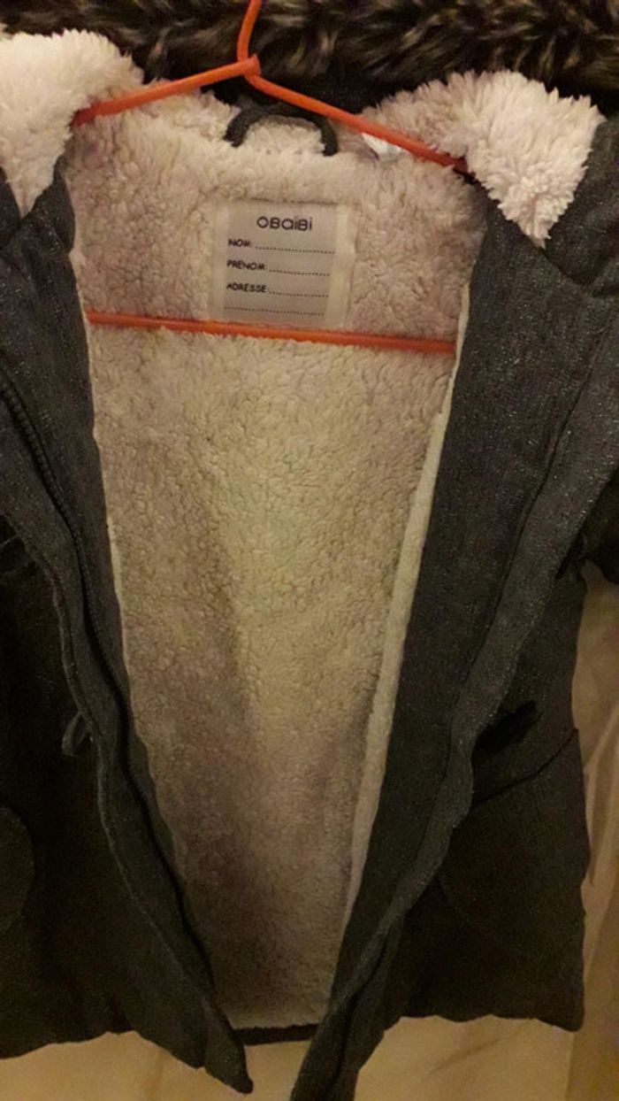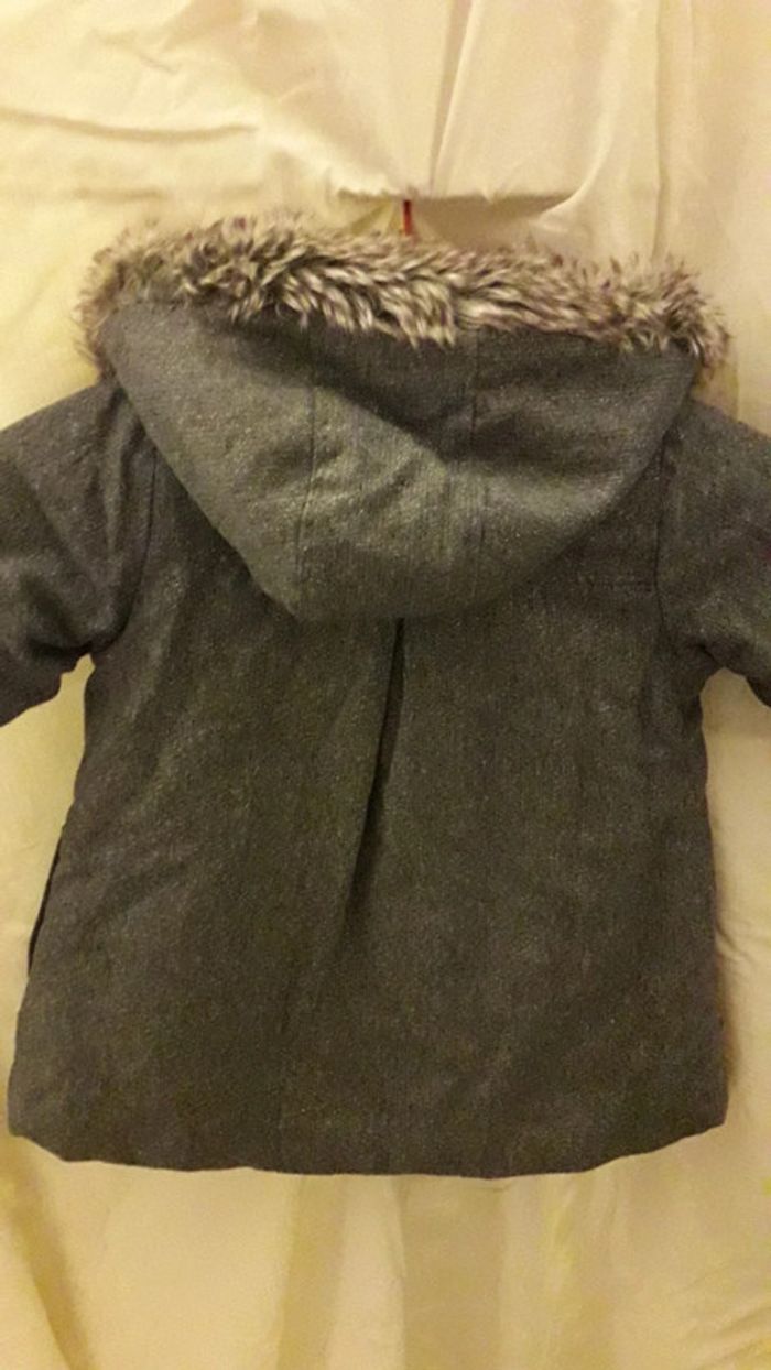 Manteau bien chaud gris pailleté 23 mois/86 cm Porté, bon état, rien à signaler Zip et boutons Tissu extérieur : polyester et laine Intérieur : fourrure synthétique et polyester