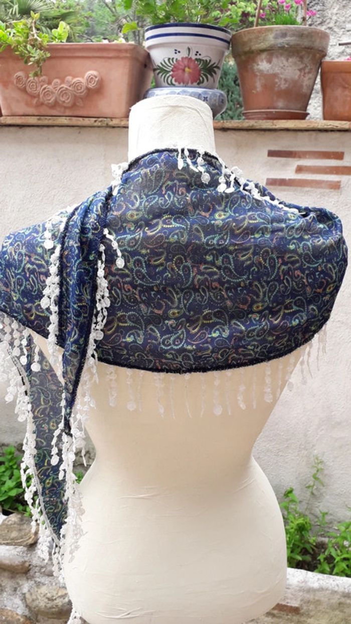 Foulard triangulaire motif cachemire bordé de dentelle Longueur 146 cm. Du haut à la pointe du triangle 26,5 cm Coton très léger