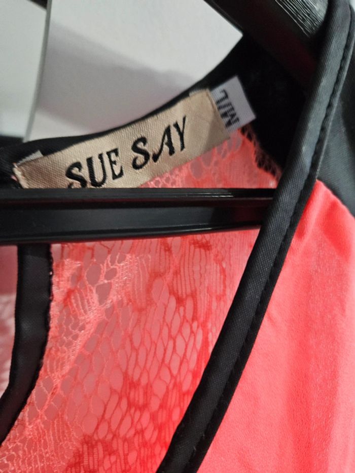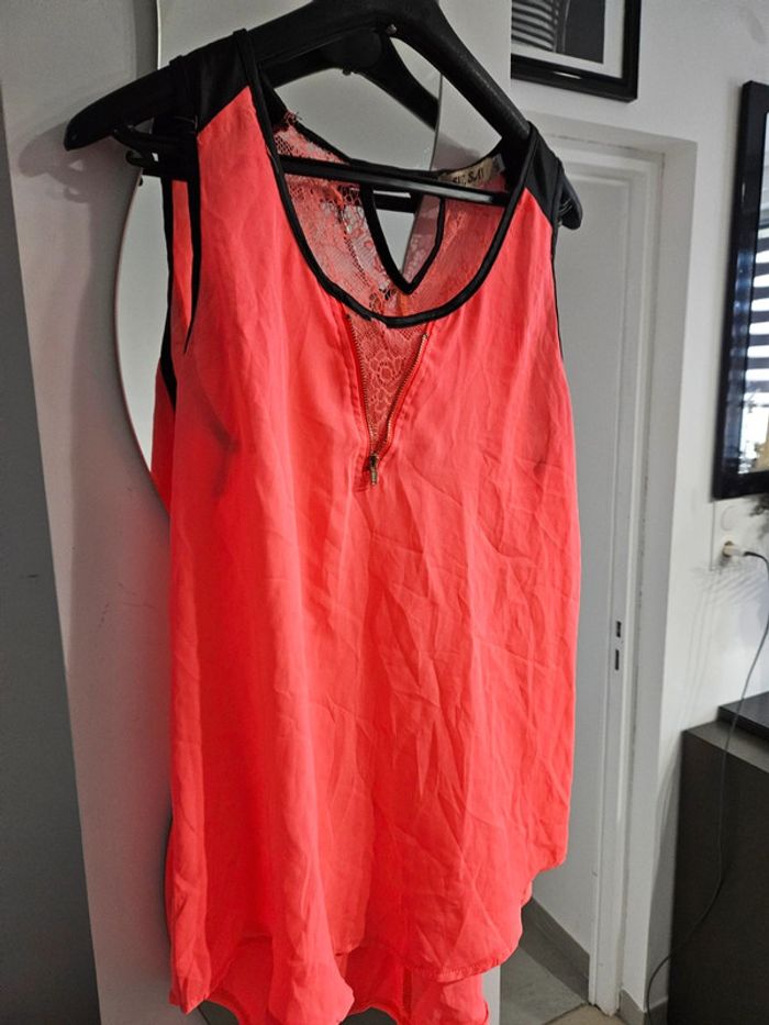 🌺🌺Bonjour🌺🌺 👇👇 Vend haut de couleur orange et noir de la marque Sue say taille M L 💎 contient 65 % de coton 35 % de polyester💎 ➡️se porte plus court sur le devant et plus long derrière. détail sur le devant d'une petite fermeture et de la dentelle voir photos porter un petit top en dessous il est transparent