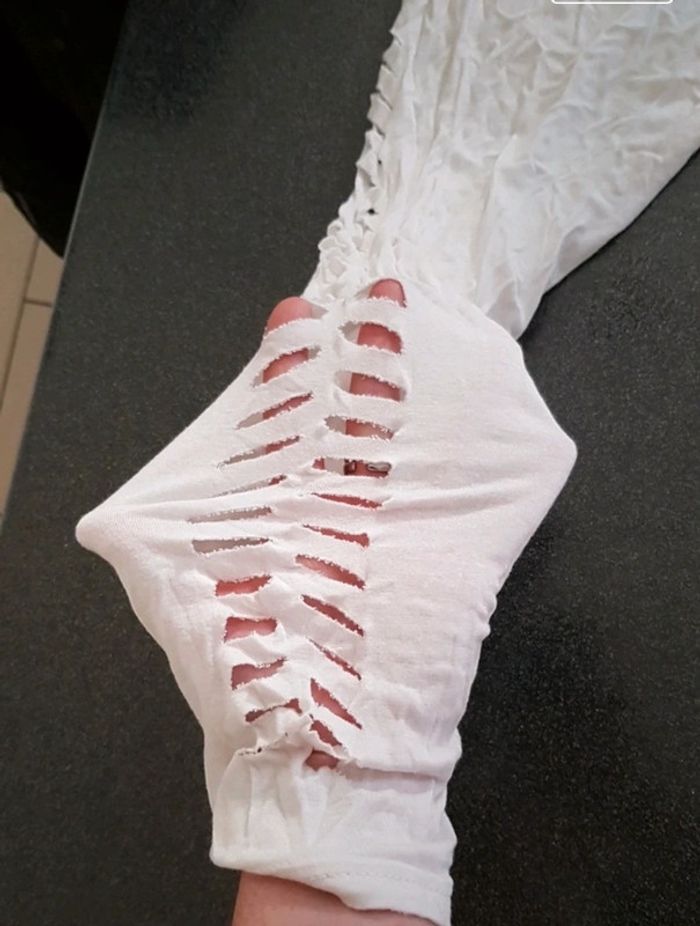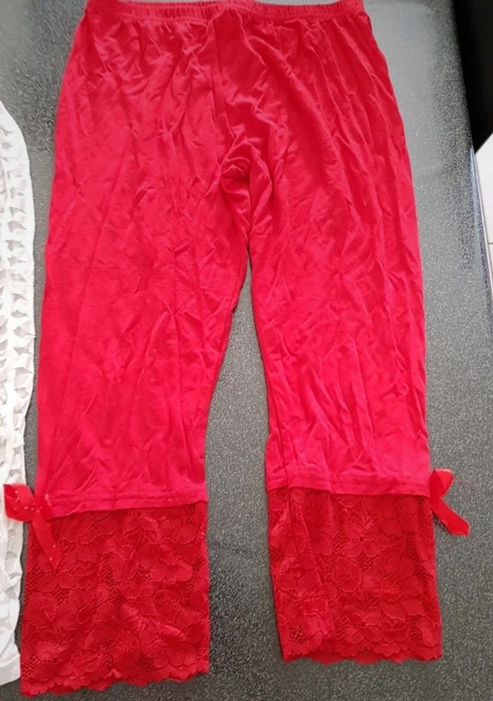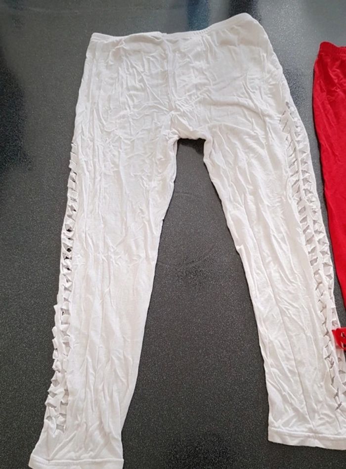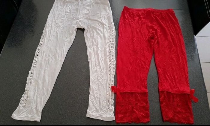 Bonjour vend lot de 3 collants puis 2 leggings rouge et blanc ➡️➡️ 1 couleurs violet un couleur vert qui s'arrête au niveau des chevilles 1 couleur bordeaux resil. Ils sont ni troué ni formés d accroc. lot de 2 leggings matière très fine travailler sur le blanc tout le long du côté par des trous voir photos et le rouge travailler en dentelle sur le bas avec des petit nœud tous les deux sont en taille unique