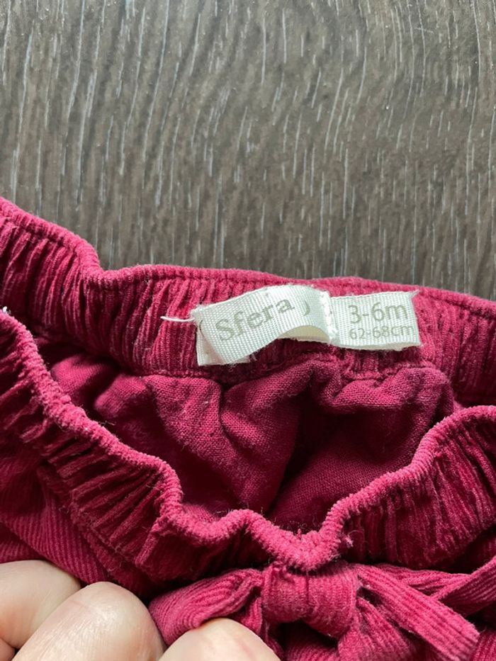 Marque Sfera, pantalon en velours couleur bordeaux. Excellent état, peu porté. Taille 3-6 mois.