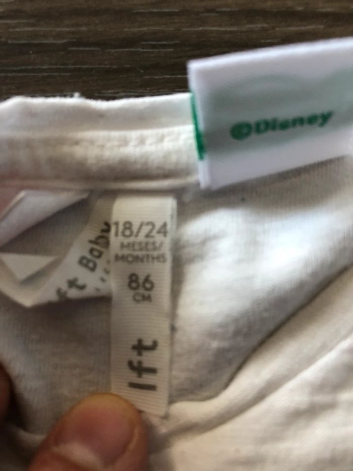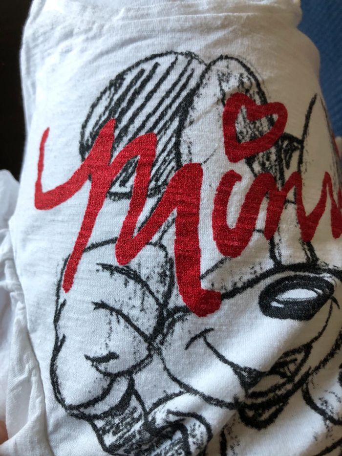 Haut avec motif Disney, Minnie. En très bon état. Taille 18-24 mois assez grand (peut convenir jusqu’à 3 ans). Couleur blanc avec lettres paillettées en rouge. Marque Lefties.