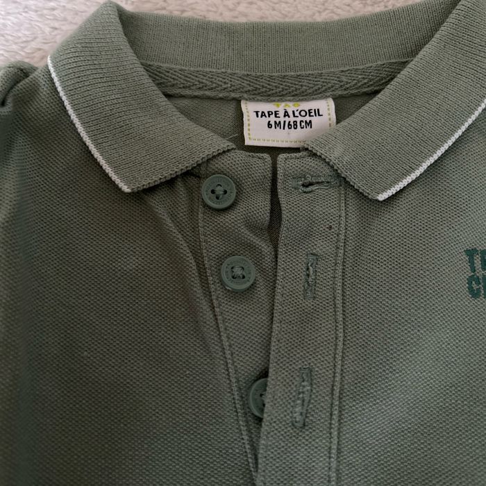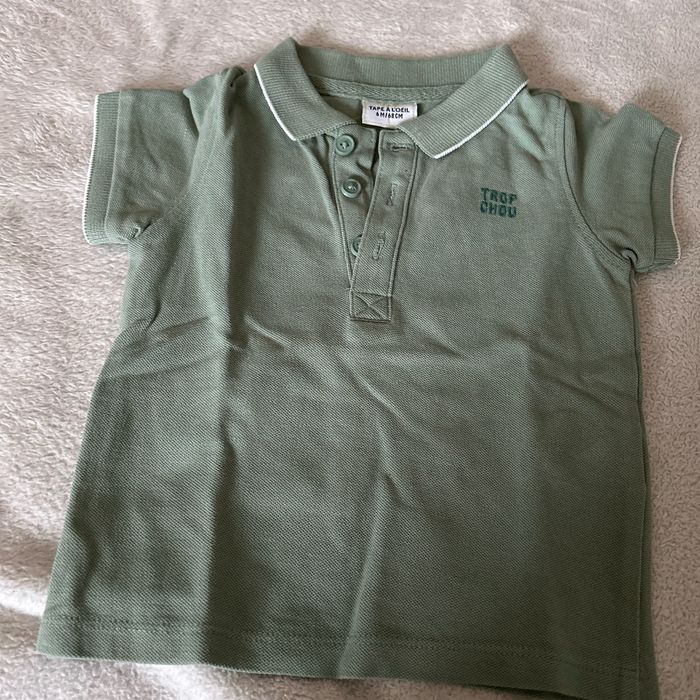 T-shirt manches courtes tape à l’œil. À une petite tache blanche comme on peut voir sur la photo, ne se voit presque pas. Taille 6 mois
