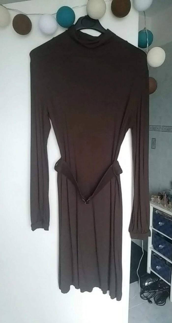 Robe marron avec ceinture. Arrivé en dessous du genou. Bon état.