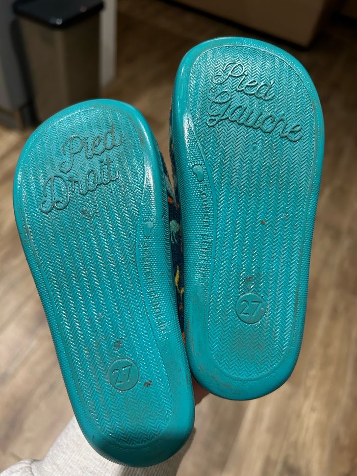 Chaussons avec soutien plantaire Taille 27 en bon état, mais un est usé sur le dessus (voir photos).
