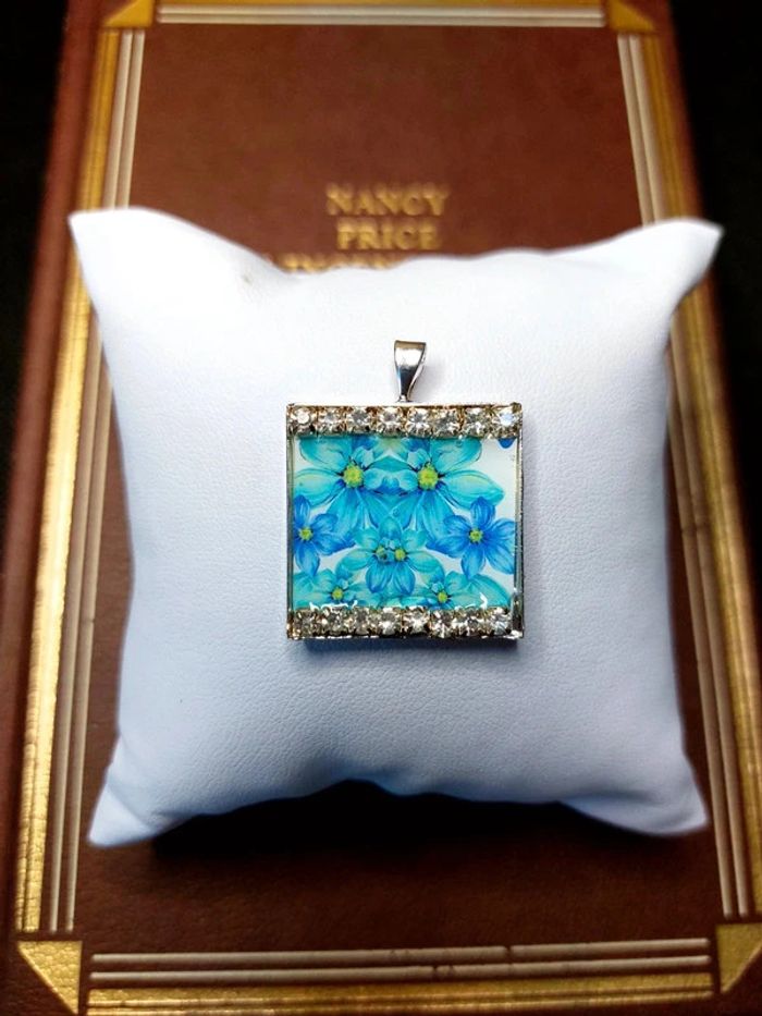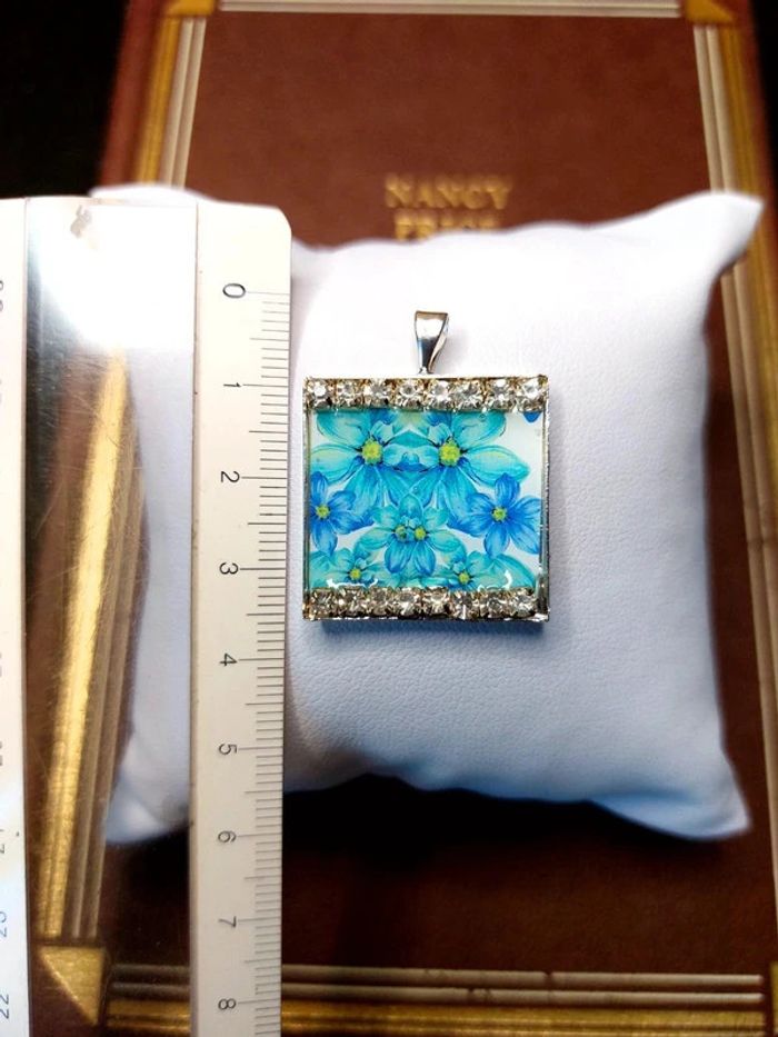 Magnifique pendentif carré avec strass et image de fleurs bleues - photo numéro 1
