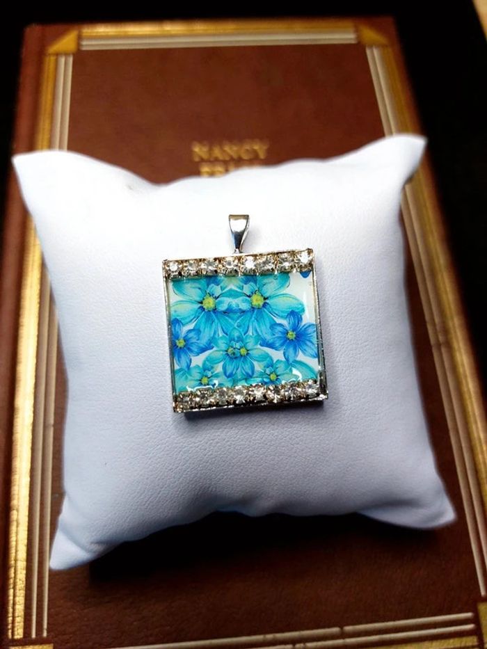 Magnifique pendentif carré avec strass et image de fleurs bleues