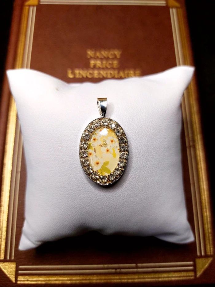 Magnifique pendentif médaillon avec strass et image fleuri jaune