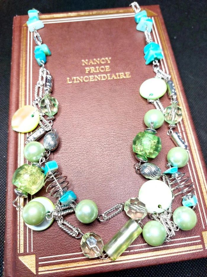 Magnifique collier sautoir double rangs en perles bleu et verte