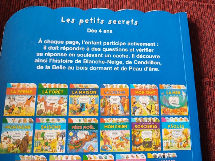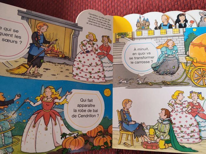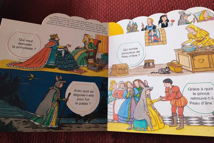 édition Fleurus / de 3 à 5 ans A chaque page, l'enfant participe activement : il doit répondre à des questions et vérifier sa réponse en soulevant une petite fenêtre. Il découvre ainsi l'histoire de Blanche-Neige, de Cendrillon, de la Belle au bois dormant et de Peau d'âne. Il y a quelques fenêtres abimées mais elles cachent bien le texte en dessous et le texte du dessus est bien lisible.