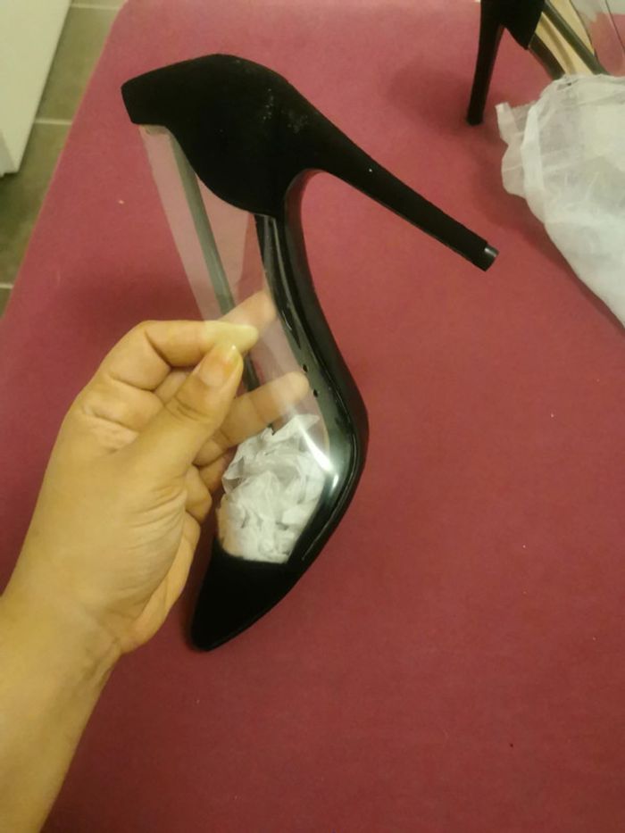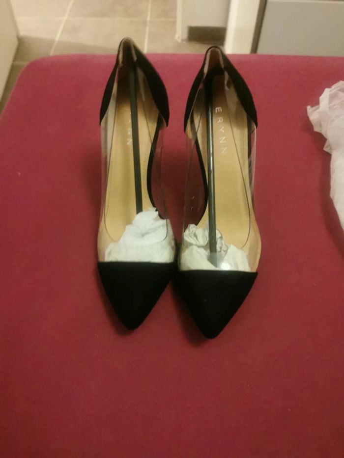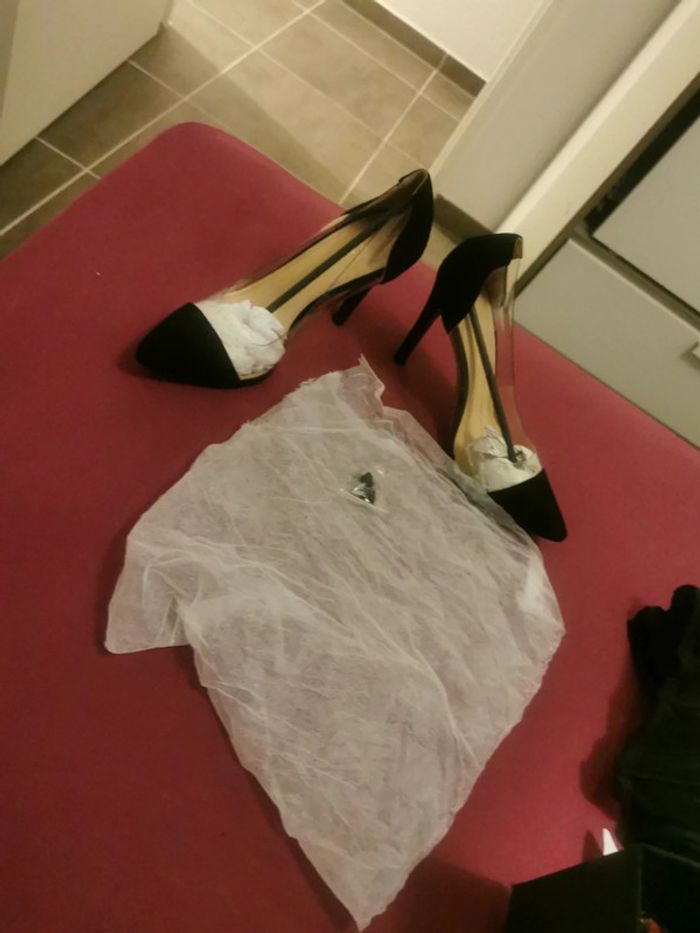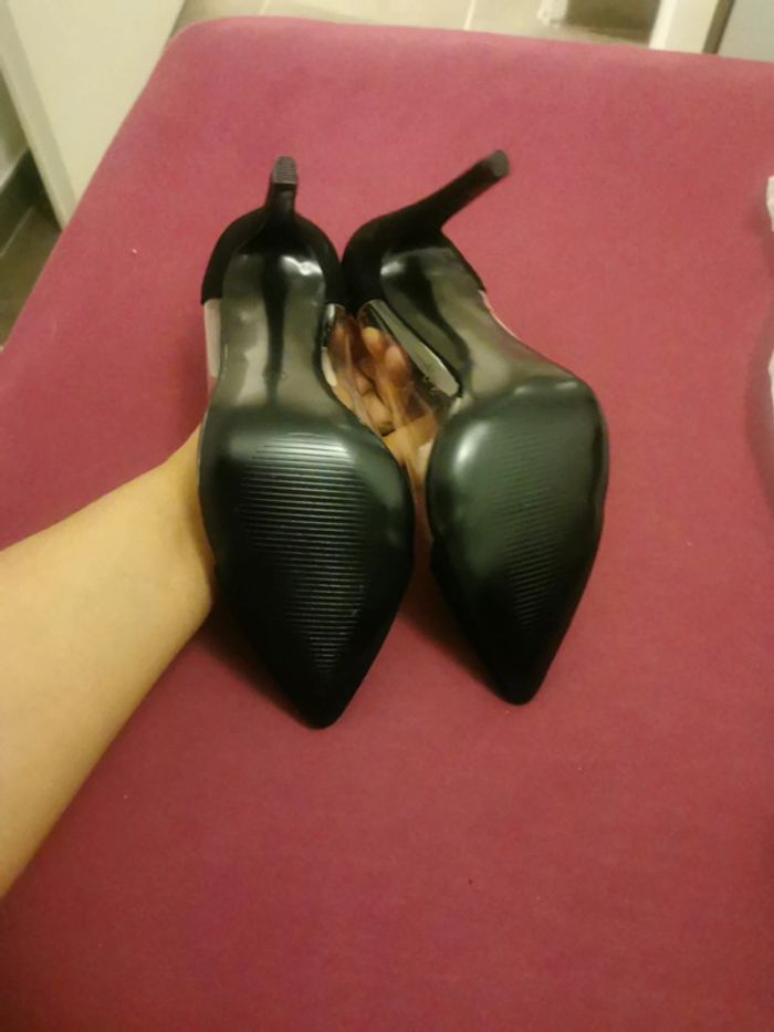 Escarpins neufs juste essayés Matière velours noir et plastique transparent avec trous pour aération Très jolies Malheureusement suite à grossesse ne me vont plus