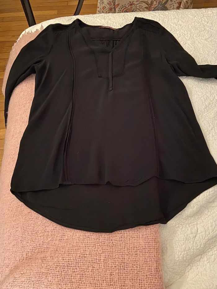 En crêpe de viscose léger, jolie blouse avec discrètes incrustations de dentelle et plis religieuse sur le devant. Légère transparence. Poignets resserrés avec petit bouton. Pans arrondis, dos légèrement plus long que le devant. Jolies finitions, en très bon état. Dimensions : largeur aisselle à aisselle 53 cm, longueur dos 70 cm, longueur face 61 cm. La blouse est bien noire sans aucune décoloration, les photos de près éclaircissent énormément le tissu et déforment le rendu réel (photos nécessaires pour observer les détails).
