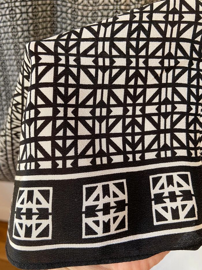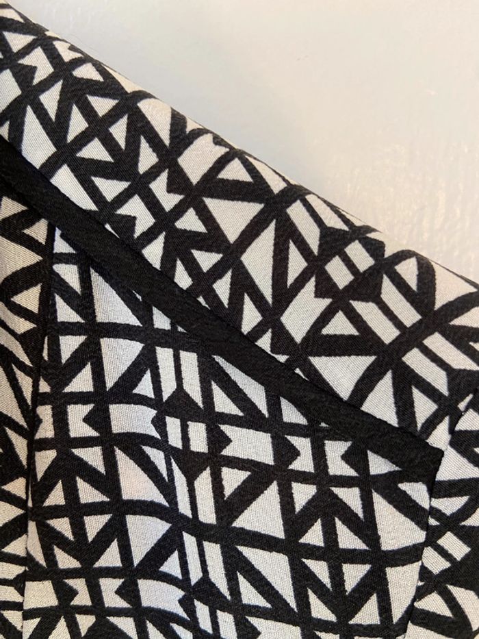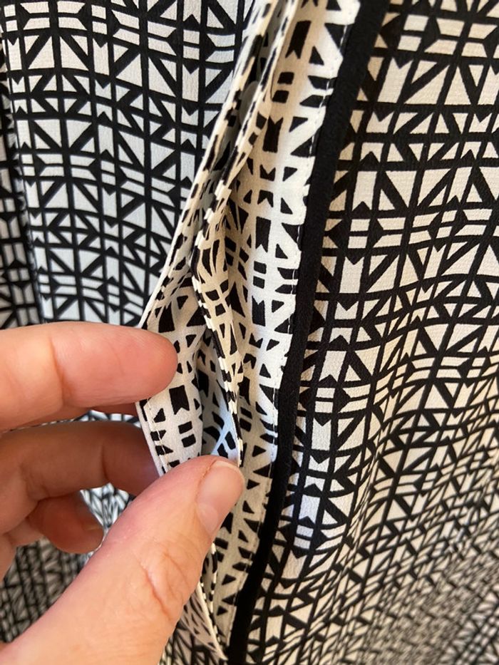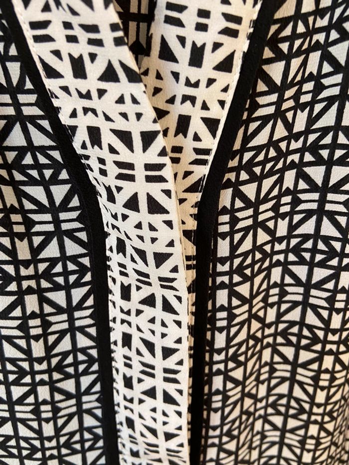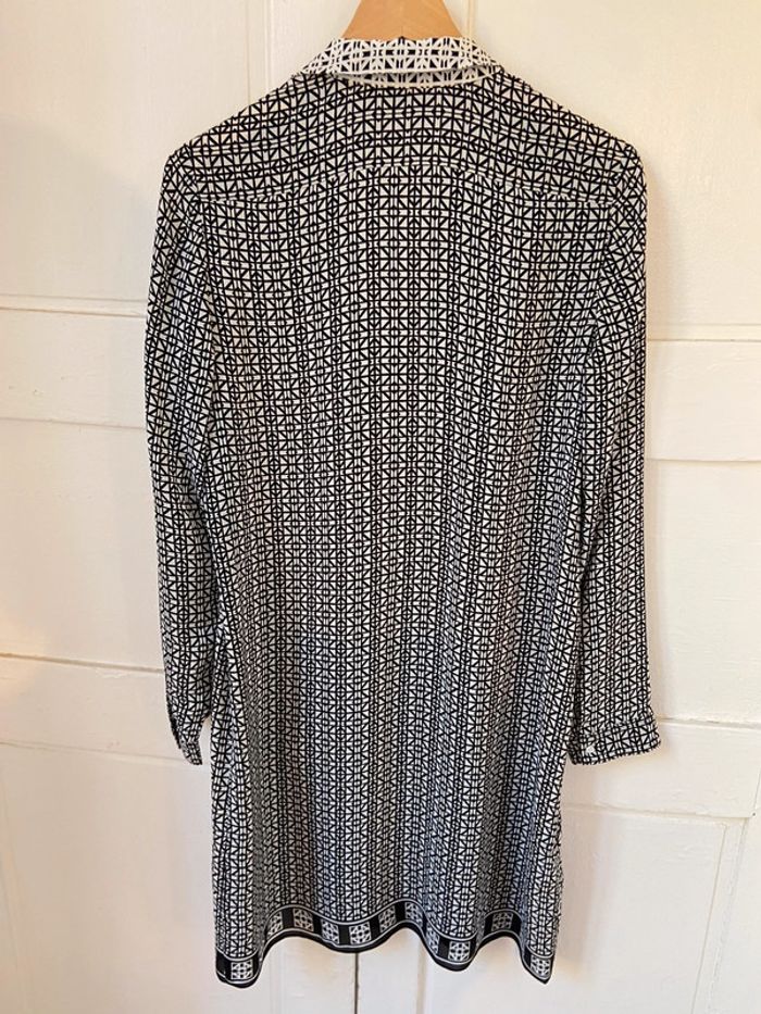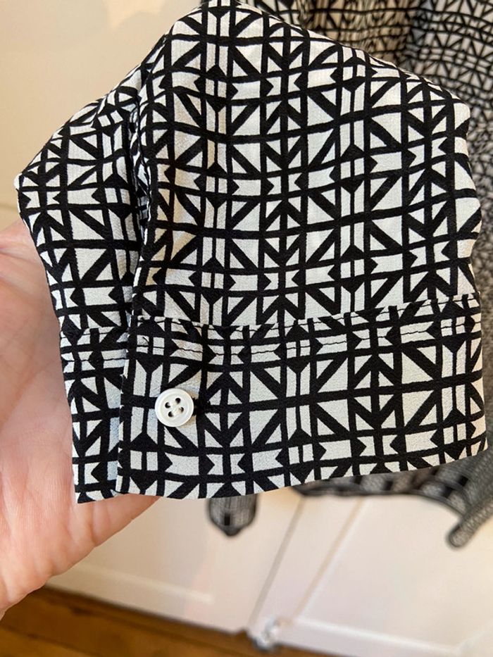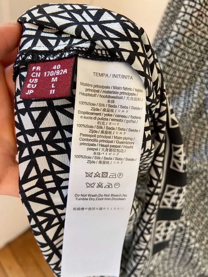 Jamais portée. Patte de boutonnage invisible. Longueur 93 cm depuis base de l’encolure dos, 73 cm depuis creux du décolleté devant, largeur aisselle à aisselle 52 cm.
