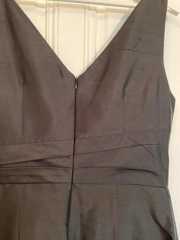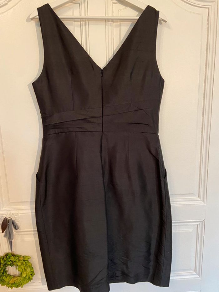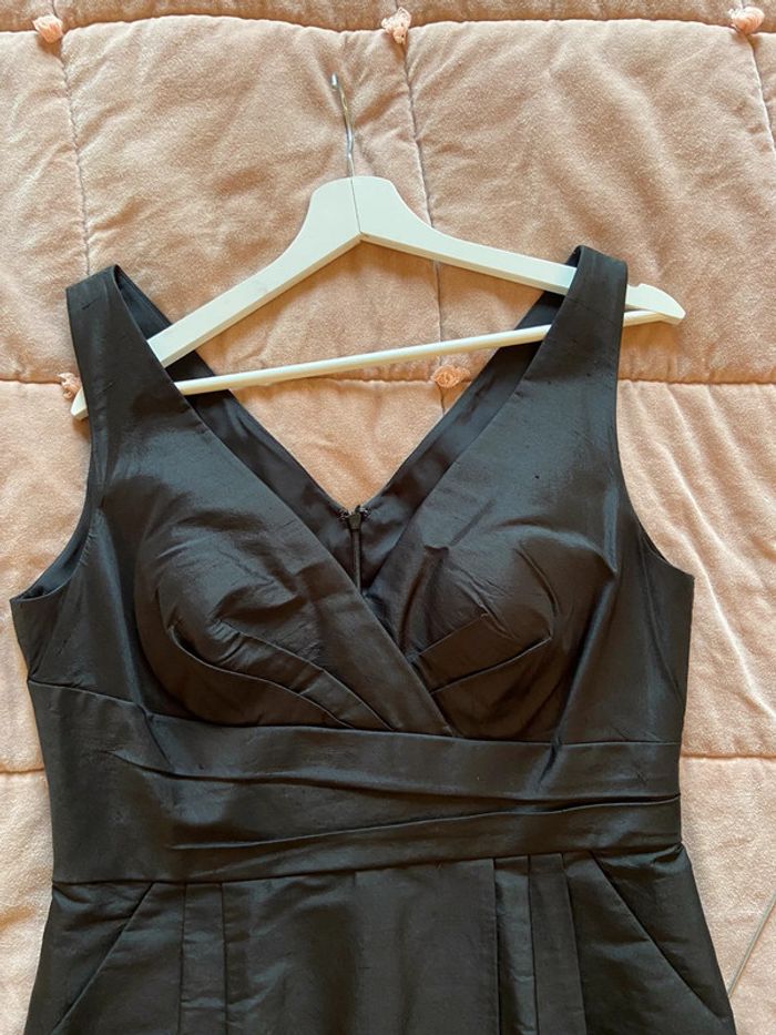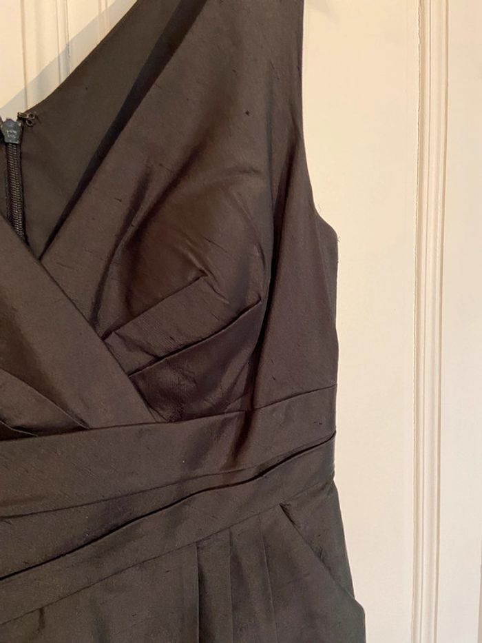 Superbe robe ultra féminine en soie sauvage entièrement doublée. Poitrine et taille drapées. Forme portefeuille arrondie devant. Fermeture éclair au dos. Poches latérales. Achetée aux États-Unis, taille américaine 12 correspondant à un 44 français. Forme très flatteuse pour la silhouette, amincit et met le décolleté en valeur. Portée une fois, comme neuve. Longueur depuis le creux du décolleté 75 cm, longueur depuis le haut des bretelles 98 cm, largeur taille 41 cm, largeur aisselle à aisselle 46 cm. La dernière photo montre l’envers de la robe.