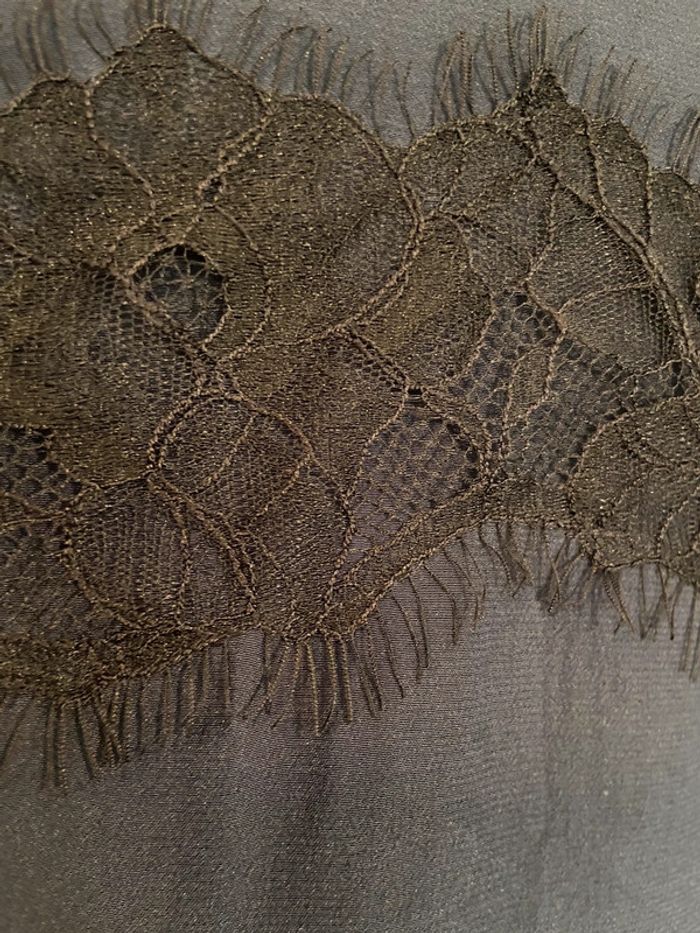 Ravissant top en soie bleu marine très foncé avec bandes de dentelle noire appliquées. L’association des deux couleurs est très élégante. Fermeture éclair au dos. En parfait état, portée une fois.