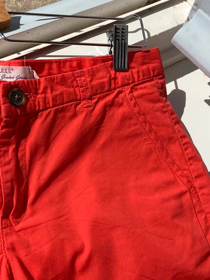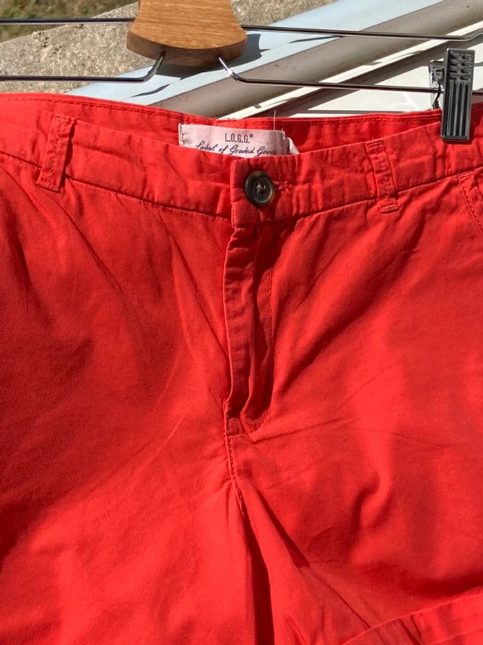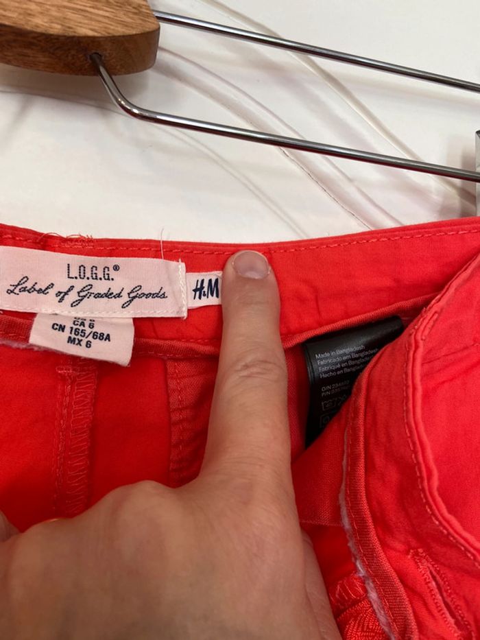 En coton, d’un très beau corail très lumineux presque fluo, couleur la plus fidèle sur la dernière photo. Poches latérales, ceinture à passants. En parfait état, à peine porté.