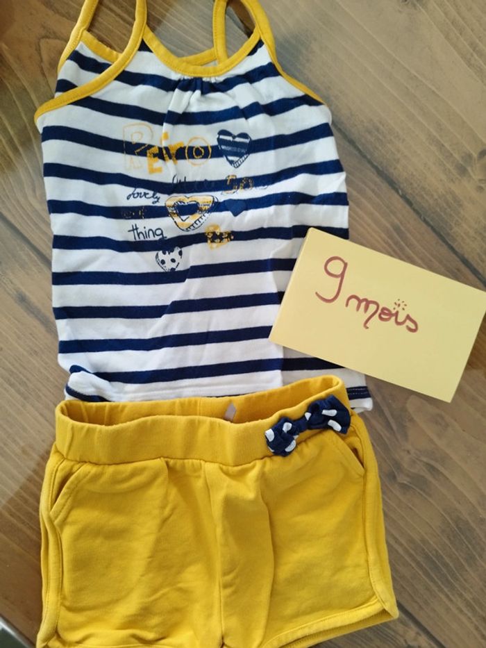 Ensemble orchestra 9 mois short et débardeur Excellent état Maison non fumeur Réduction activée sur les lots Envoi rapide et soigné