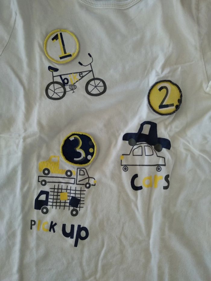 T-shirt manches courtes Vertbaudet Blanc thème véhicules 3 scratch Excellent état Maison non fumeur Réduction activée sur les lots Envoi rapide et soigné