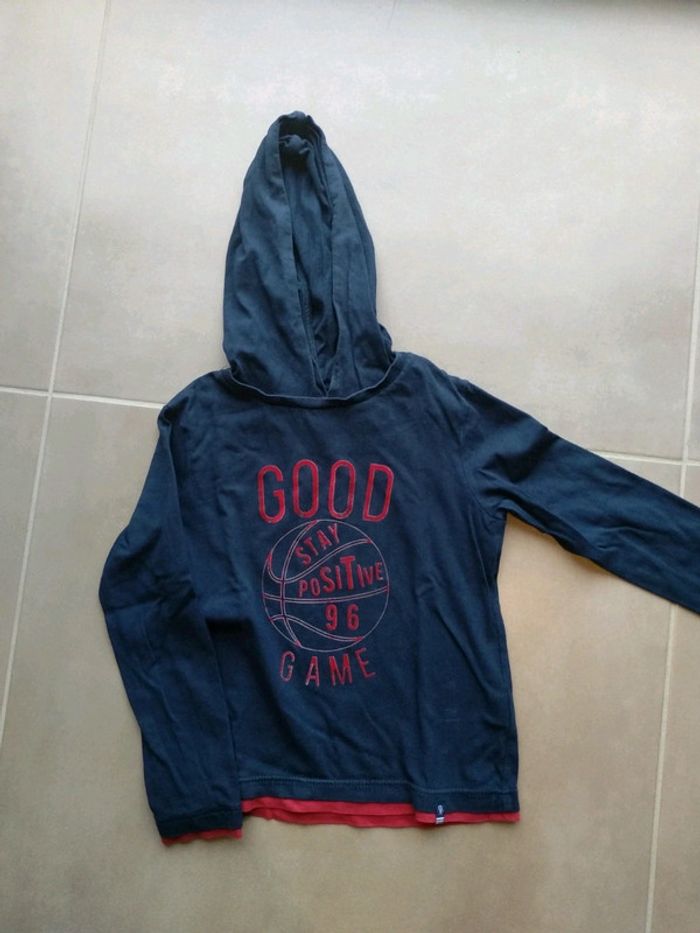 T-shirt manches longues à capuche bleu marine et rouge thème basket. Le velours du dessin est passé au niveau du ballon et sur quelques lettres