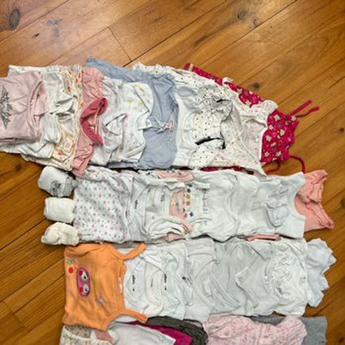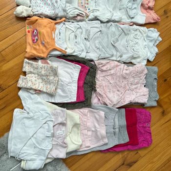 Lot vêtement fille 3 mois : 6 bas 3 gilet 3 short 1 collant 2 combinaison 22 body 3 robe 8 tee shirt 3 chaussette