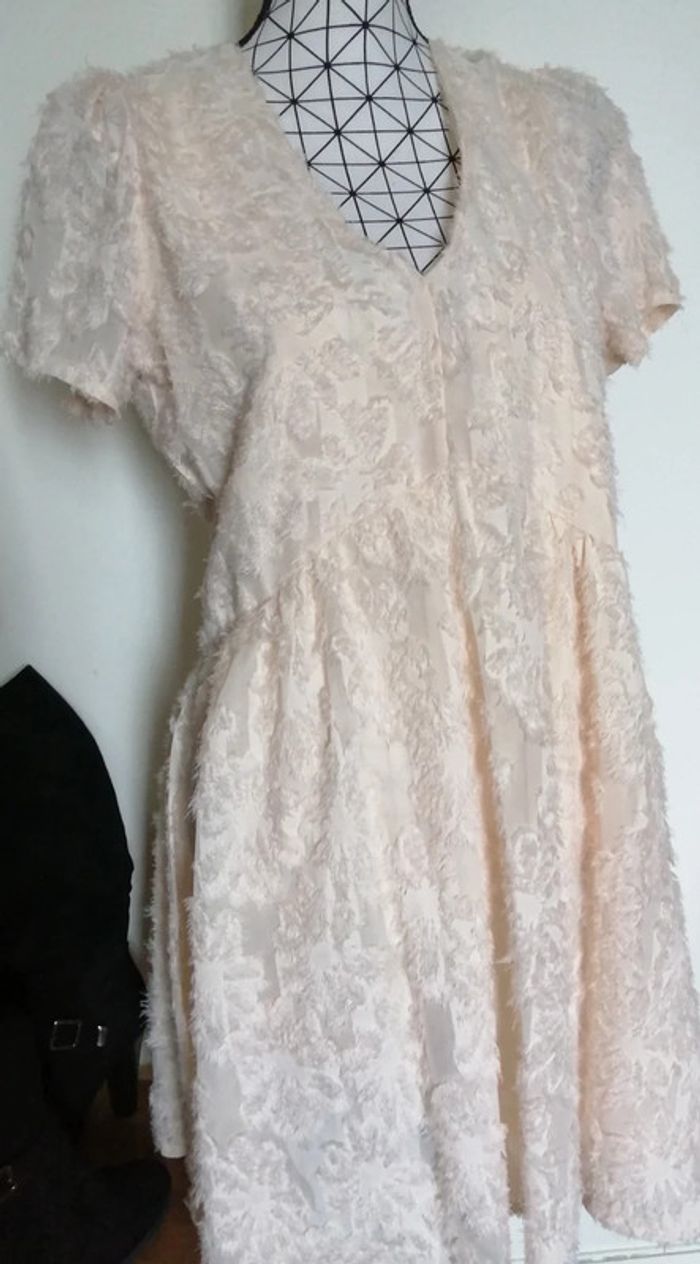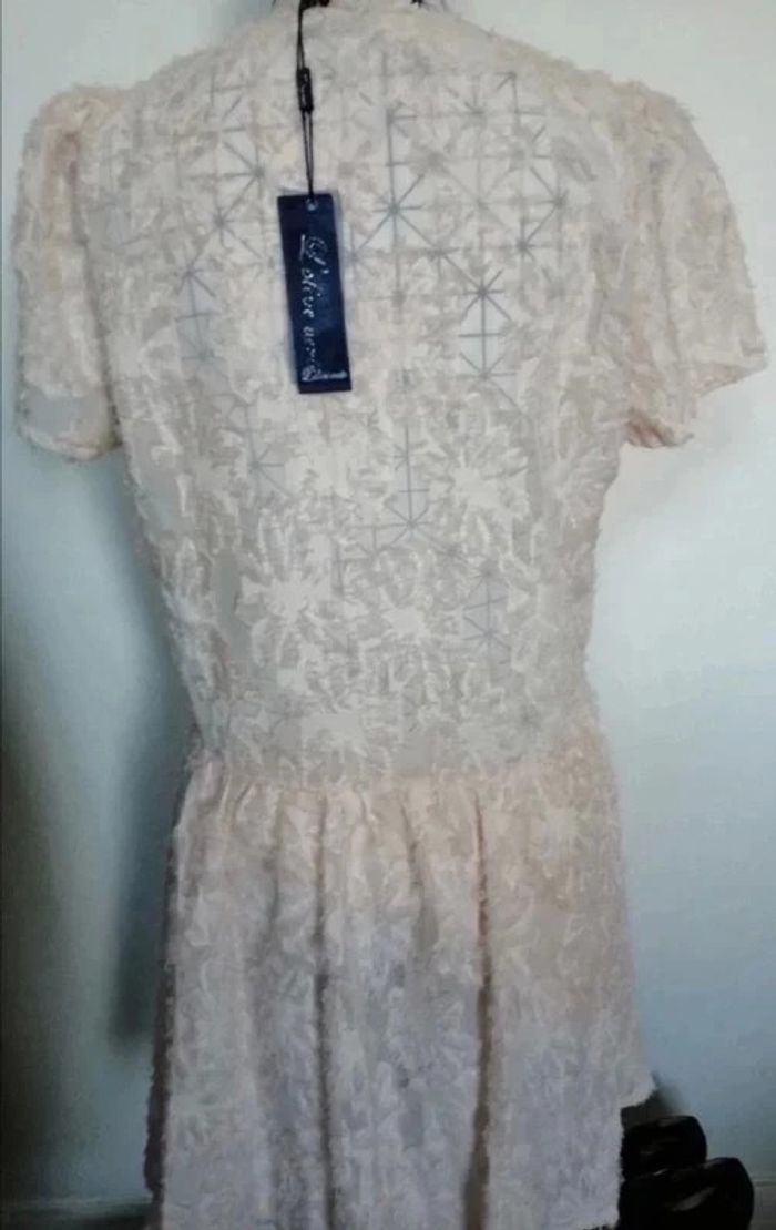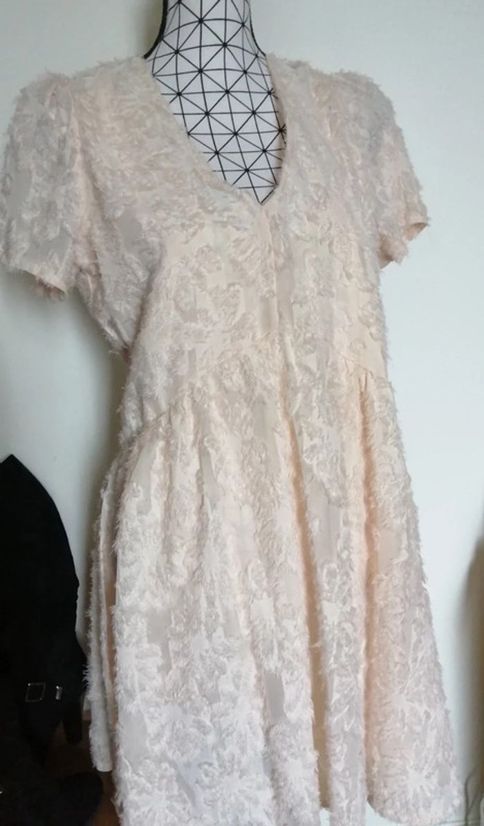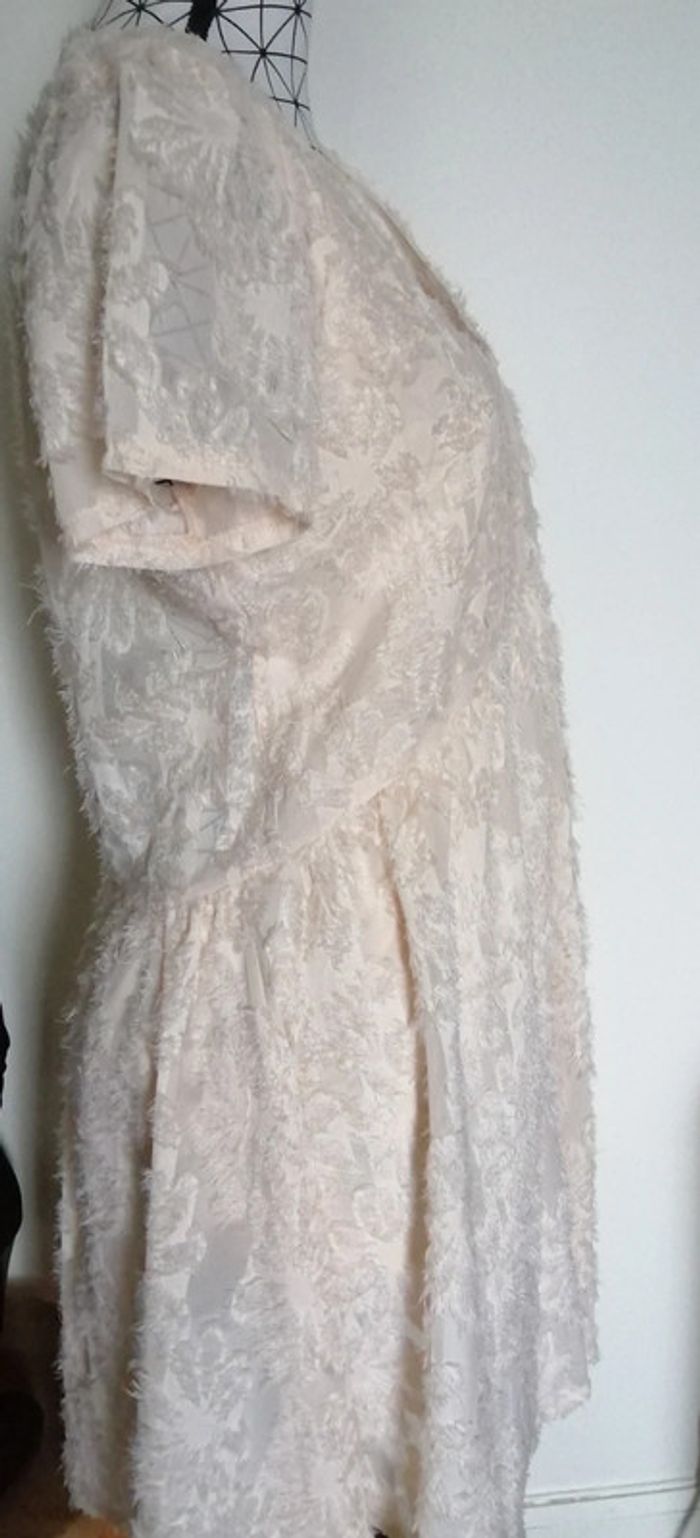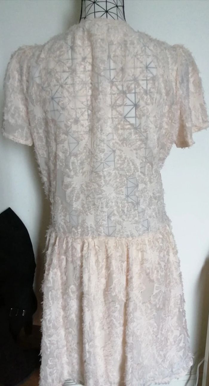 Robe patineuse Décolleté. Effet plume. Legerement transparente. Évasée. Taille 2 Neuve avec étiquette. Manches courtes