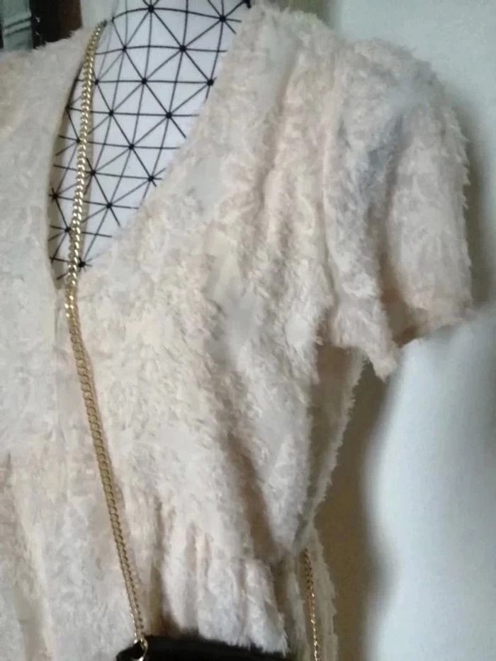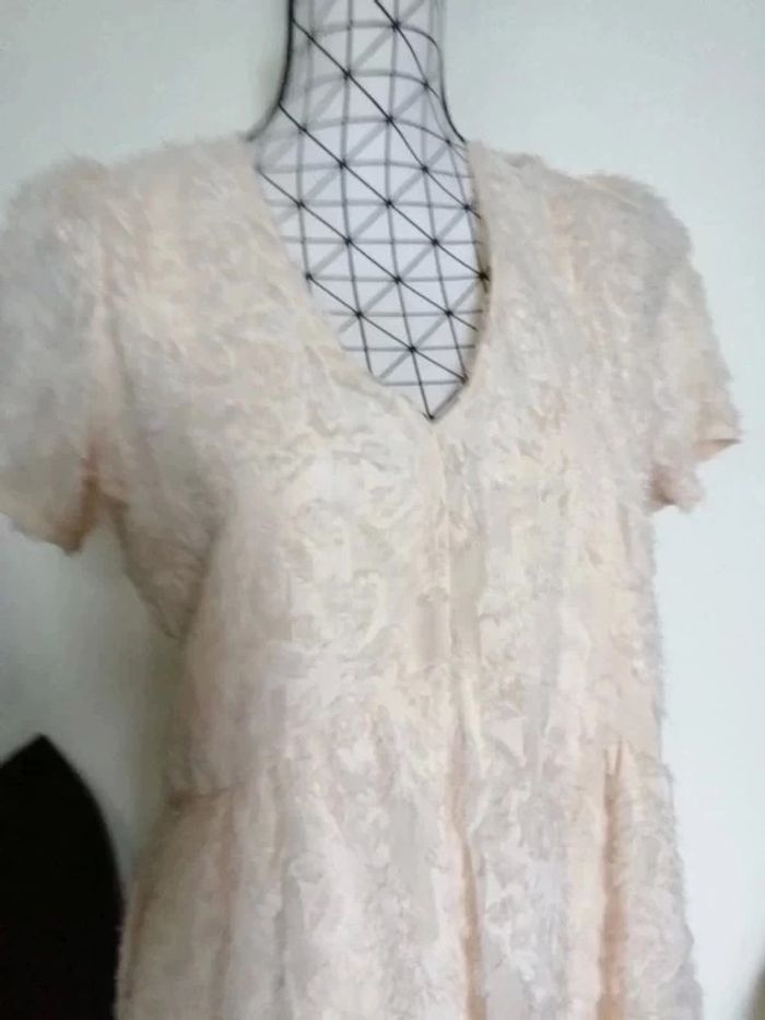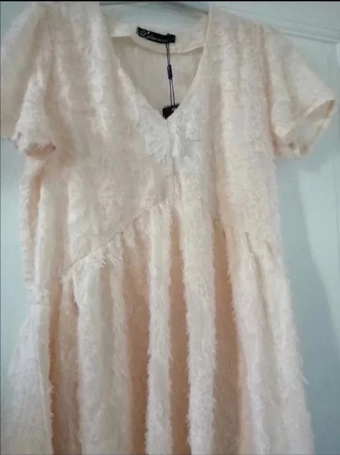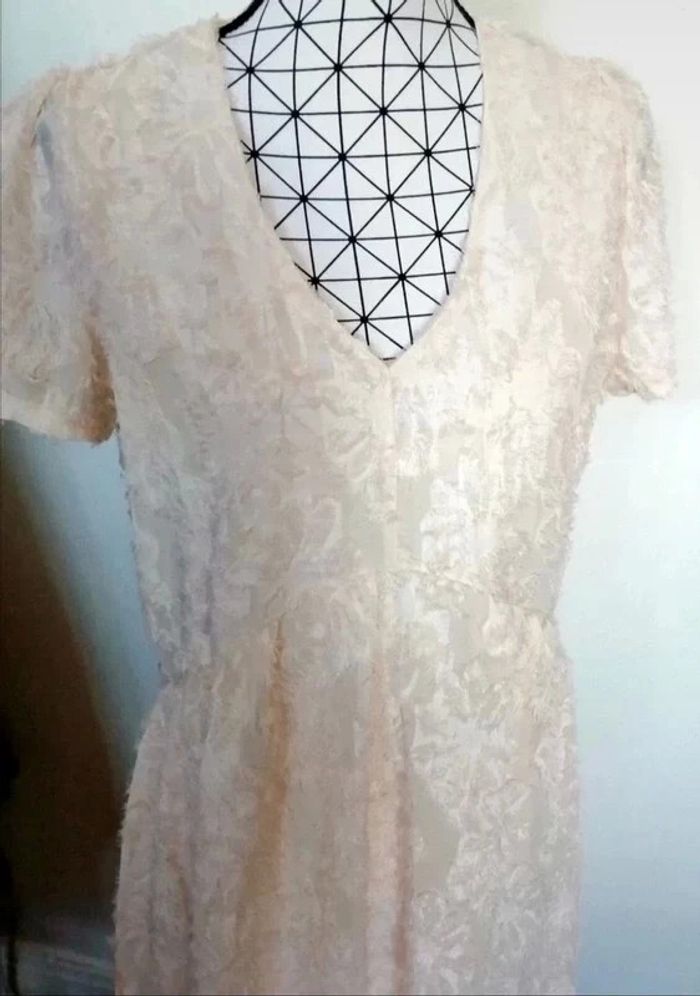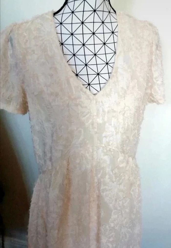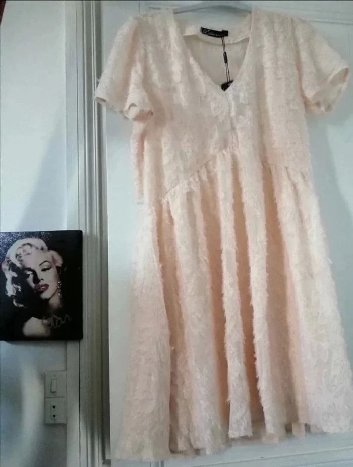 Robe patineuse Décolleté. Effet plume. Legerement transparente. Évasée. Taille 2 Neuve avec étiquette. Manches courtes
