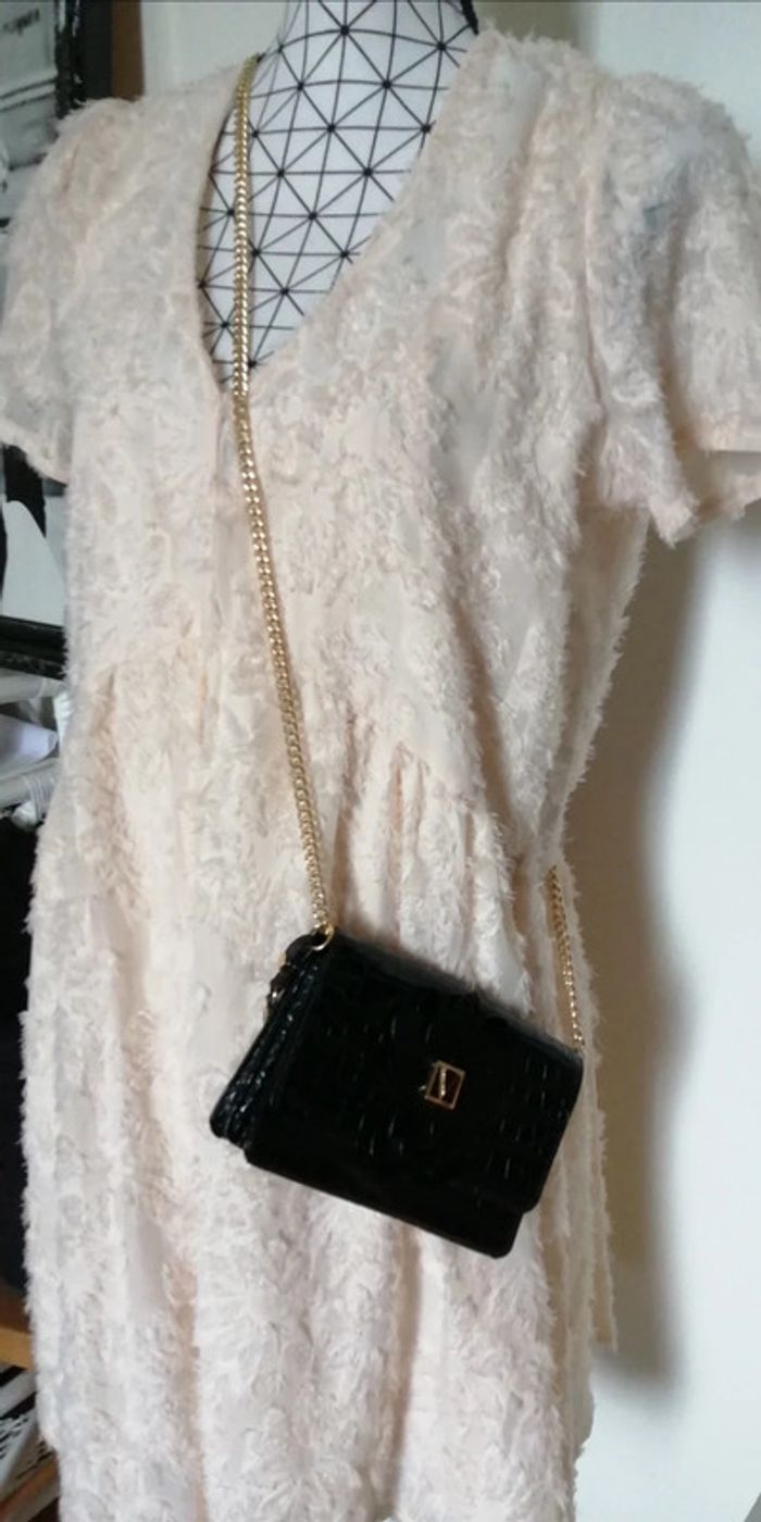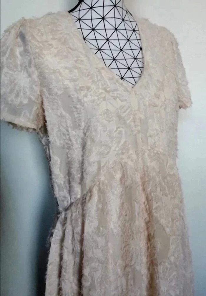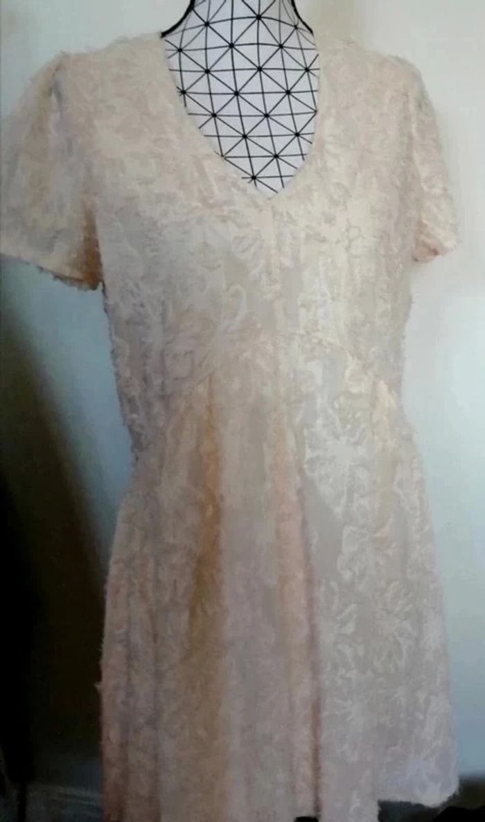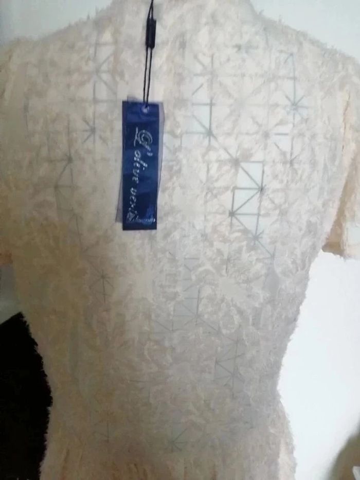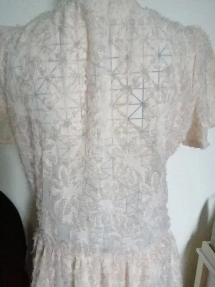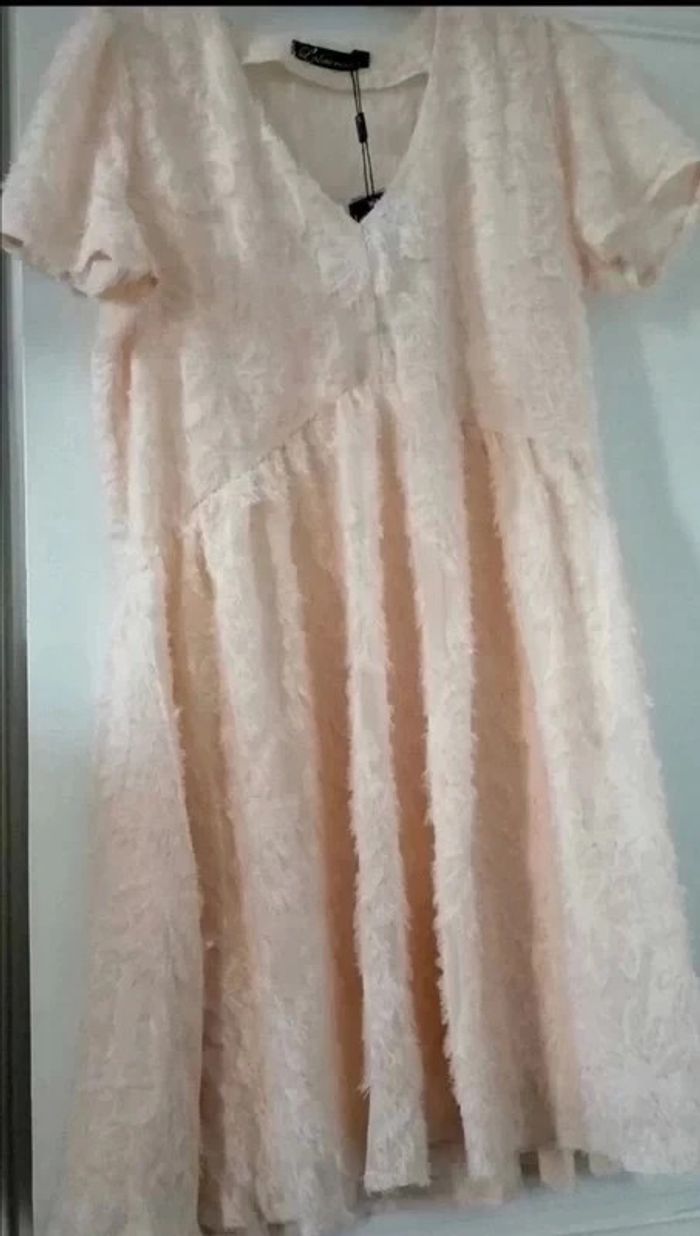 Robe patineuse Décolleté. Effet plume. Legerement transparente. Évasée. Taille 2 Neuve avec étiquette. Manches courtes