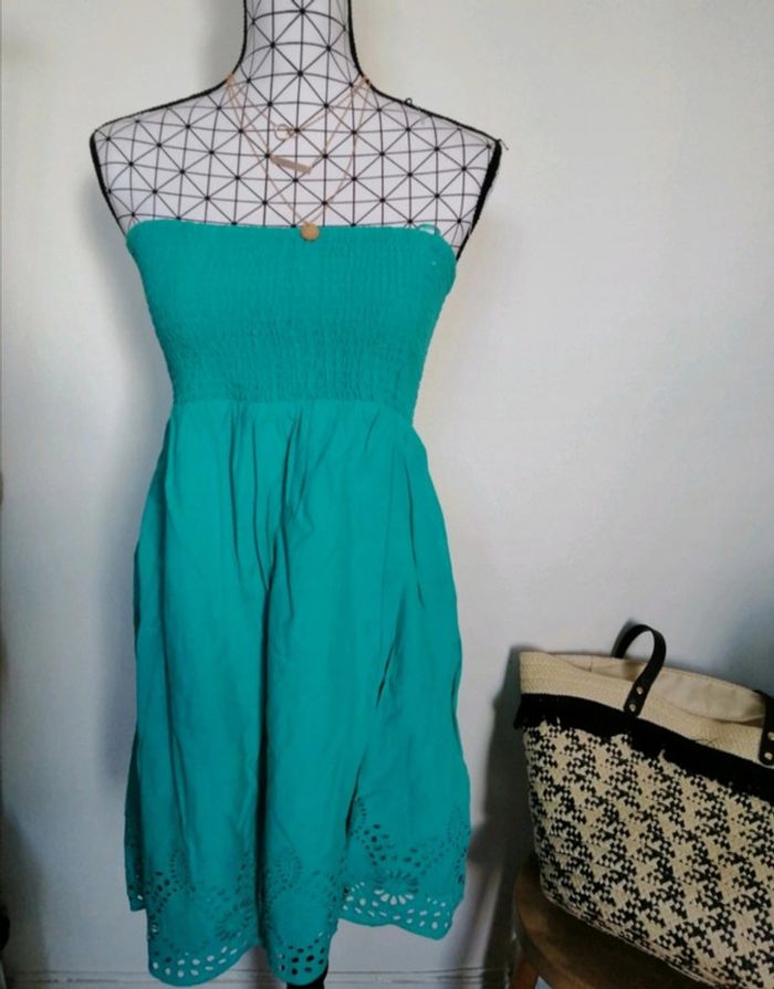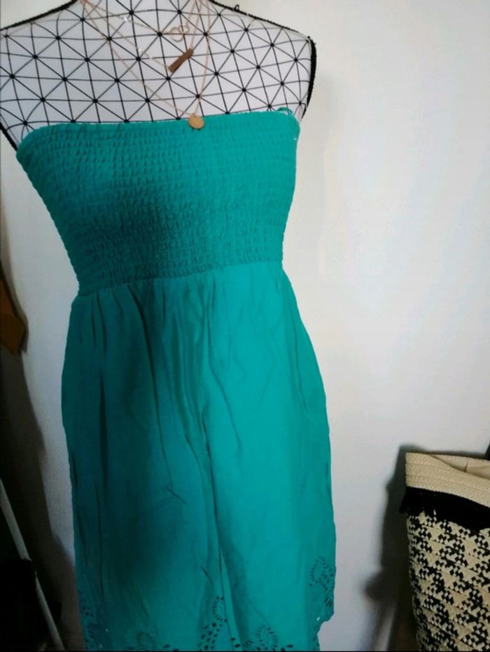 Robe Bustier d'été. Robe de plage. Parfaite pour la plage. Bleu turquoise ou vert d'eau . Bustier extensible. Doublée. Longeur bustier :16cm. Longeur totale : 66cm 100% Cotton Fabrique en France Envoi très rapide et soigné