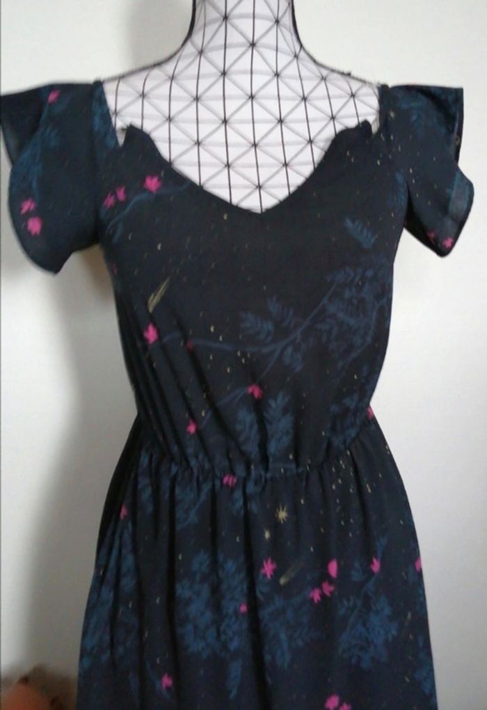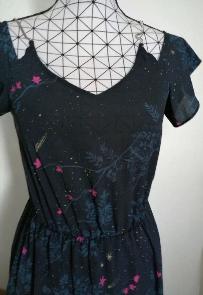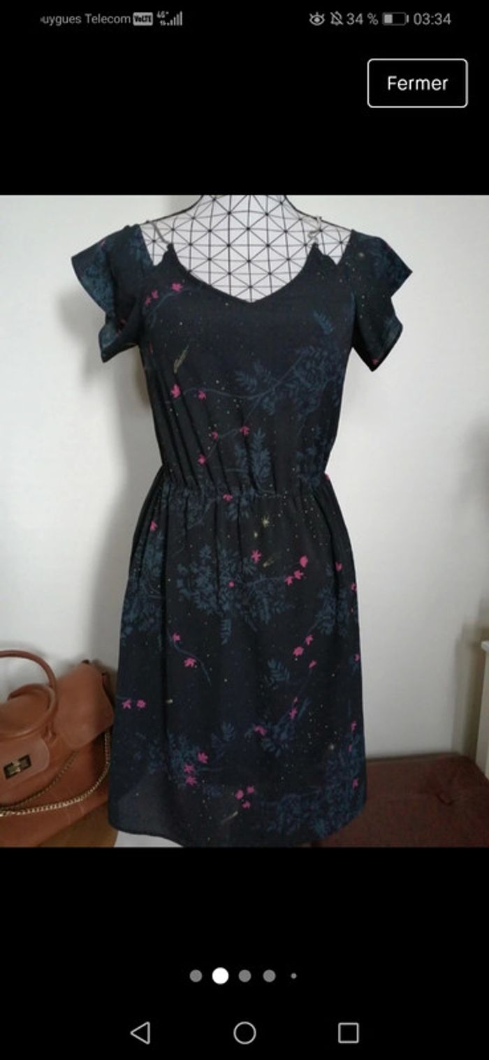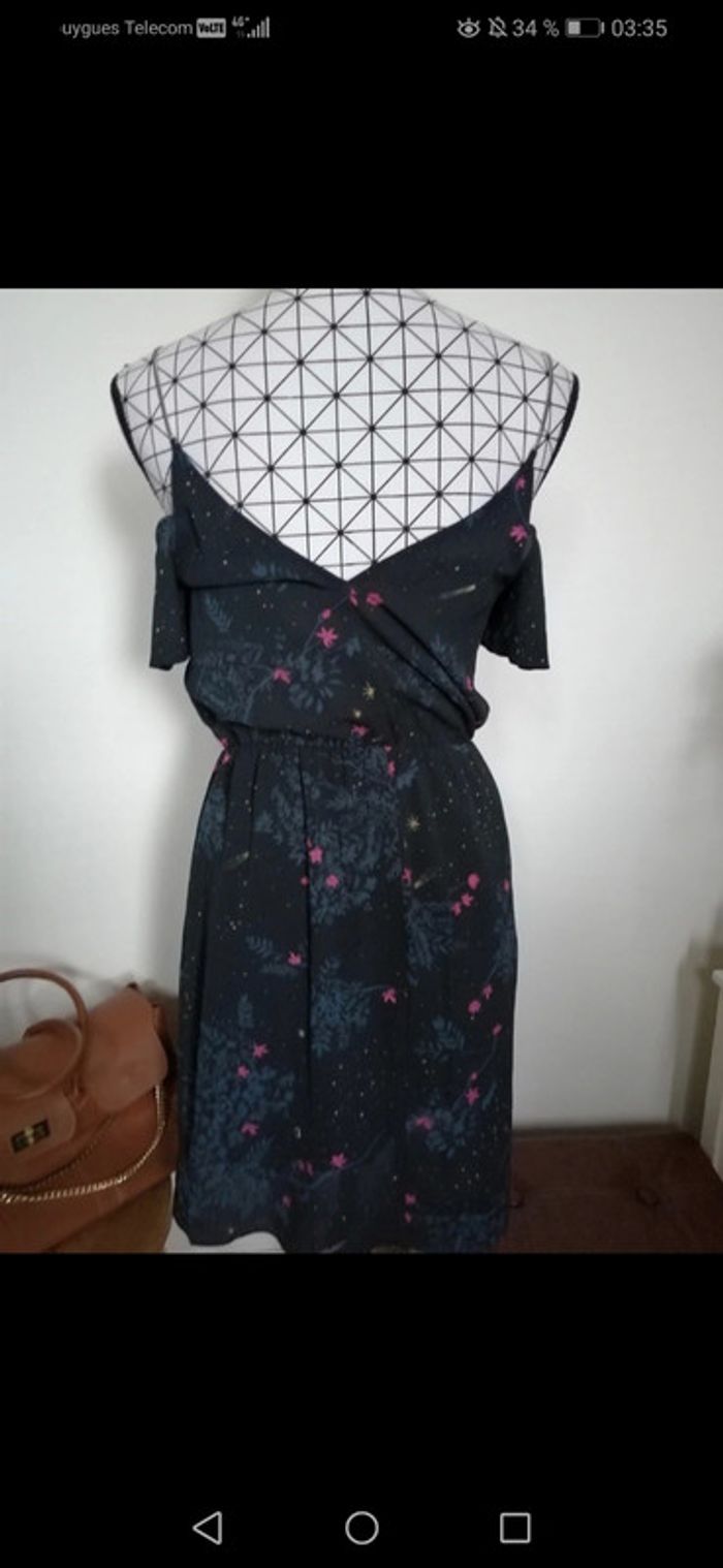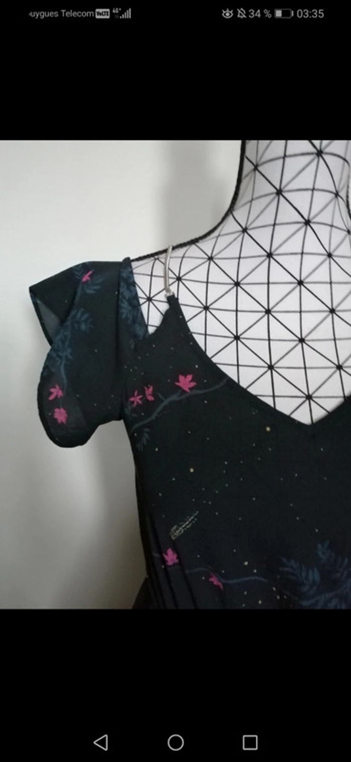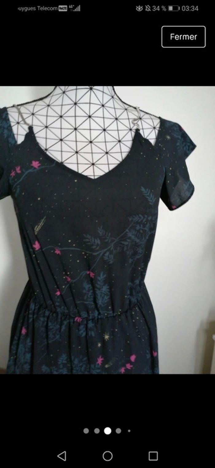 Taille extensible 38 Manches courtes originales qui se dénudent. Décolleté dos Mi longue environ 76cm du décolleté du devant au bas de la robe 94cm au total : des Bretelles au has de la robe Non transparente Désolée l'étiquette intérieure est coupée...