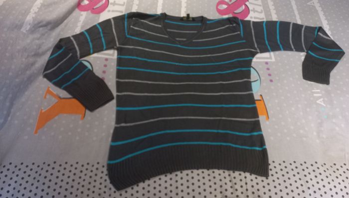 Pull fin en bon état Col en V 100% acrylique Couleur: gris foncé/ gris clair/ bleu turquoise Taille 12 ans
