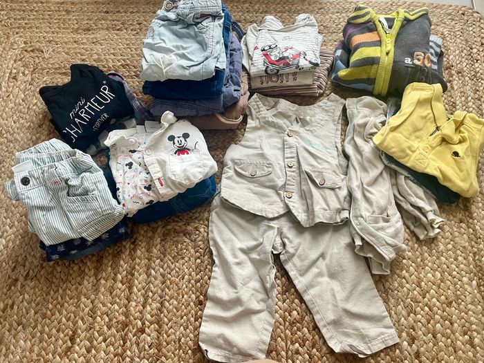 24 pièces : 2 bodies manches longues 5 pantalons 3 shorts 3 tee ML 3 tee-shirts 3 gilets 2 pulls 3 chemises