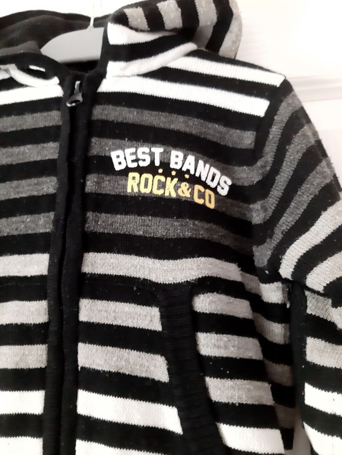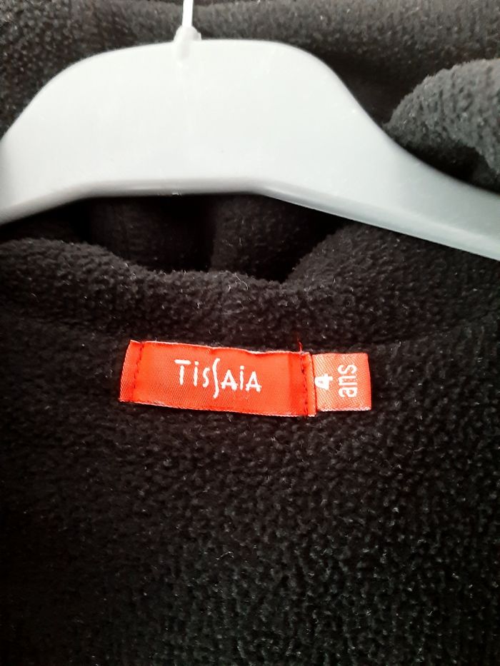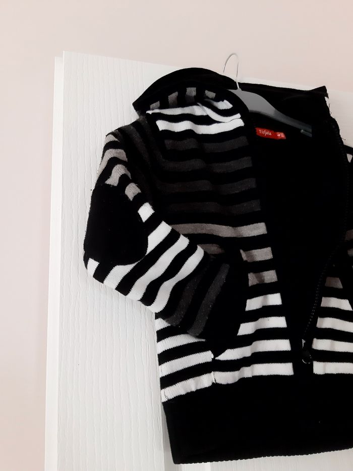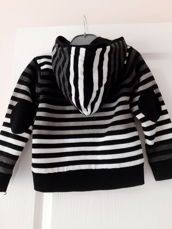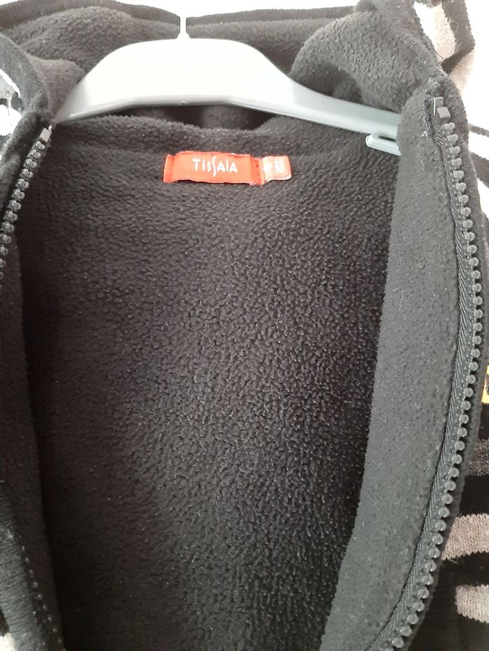 Gilet chaud, noir à rayures grises et blanches, intérieur polaire. Empiècements aux coudes, très joli porté. Tissaïa 4 ans.
