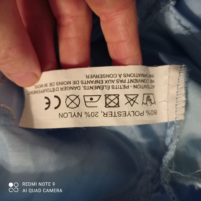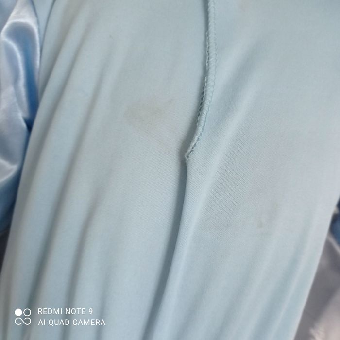 Il y a quelques taches qui se fondent dans le bleu. À recoudre sur quelques cm au plastron. Pas sûre de la taille. Mesures sur demande.