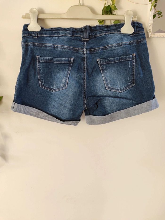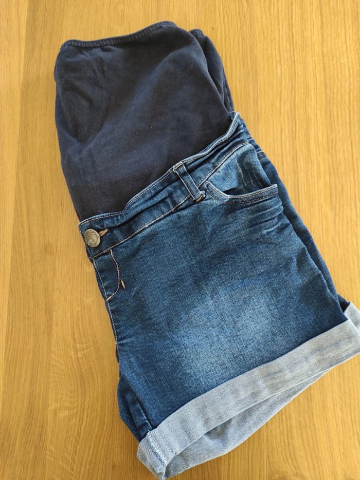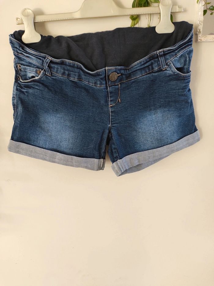 Short de grossesse en jean avec bandeau haut en coton. Ceinture réglable grâce à un système d'élastiques à l'intérieur de la ceinture. Idéal pour l'été. A été bien porté mais reste en très bon état, sans tâches ni trous.