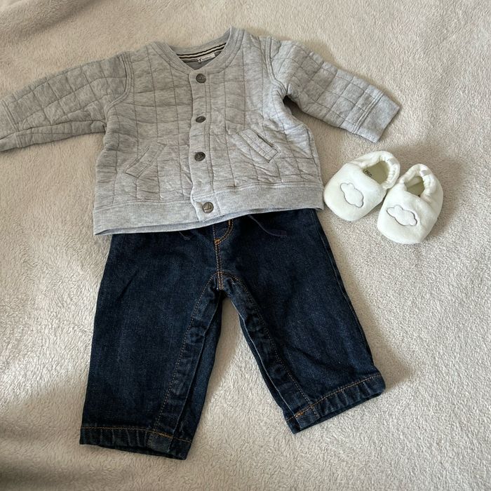 Ensemble petit bateau composé d’un gilet épais avec ouverture pression et d’un jean doublé avec ouverture pression à l’entrejambe. Taille 3 mois. Très bon état .