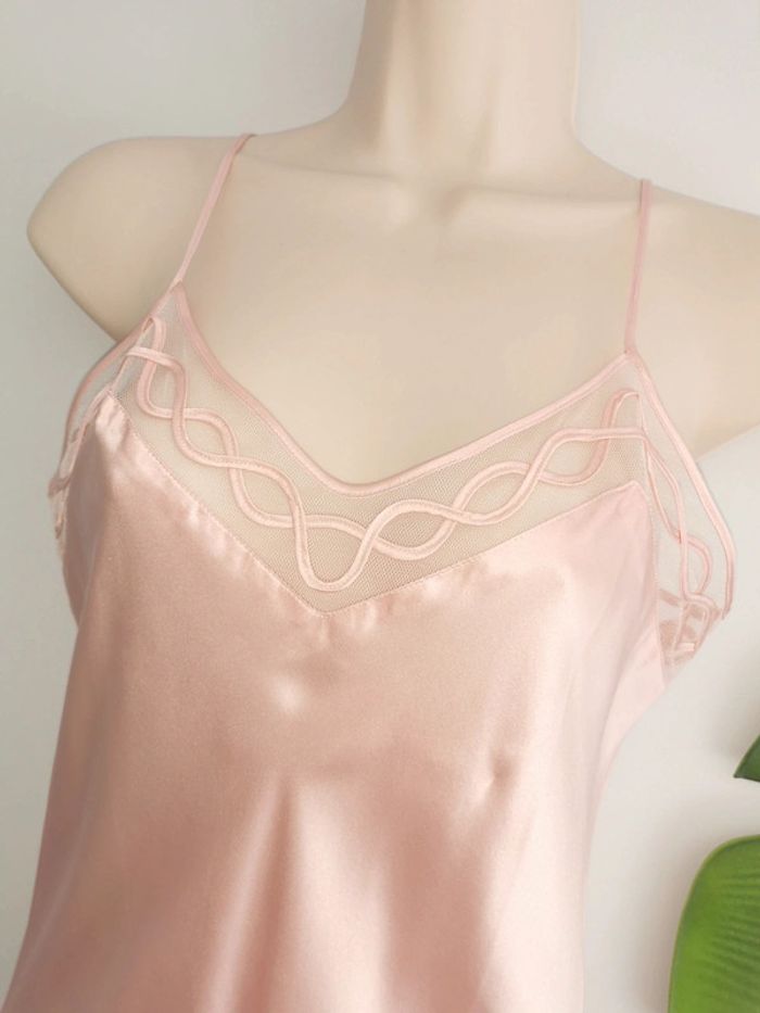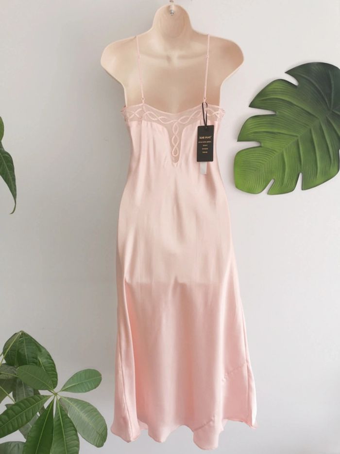 Nuisette longue en soie rose pâle Col en dentelle Soie Plus Taille S - photo numéro 3