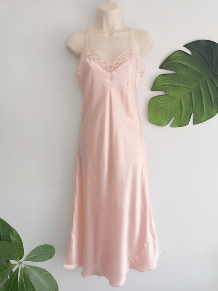 Nuisette longue en soie rose pâle Col en dentelle Soie Plus Taille S - photo numéro 1