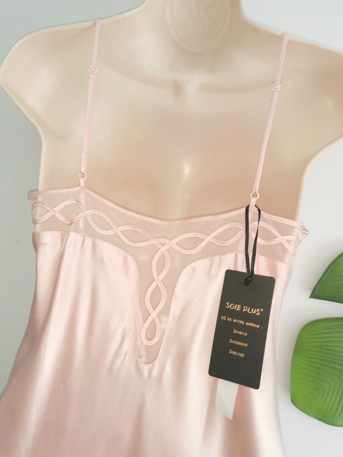 🙎‍♀️ ARTICLE NEUF AVEC ÉTIQUETTE 🙎‍♀️ Nuisette longue rose pâle 👩 Soie Plus Taille S • Matière: 100% soie de mûrier • Coupe mi-longue (genoux) • Fines bretelles réglables • Col en V à dentelle • 📏 Tour de poitrine: 88 - 92 cm 💰 Prix boutique: 179€ Parfait état👌, avec étiquette🏷️, jamais portée #SoStyLifemmetailleS 💓