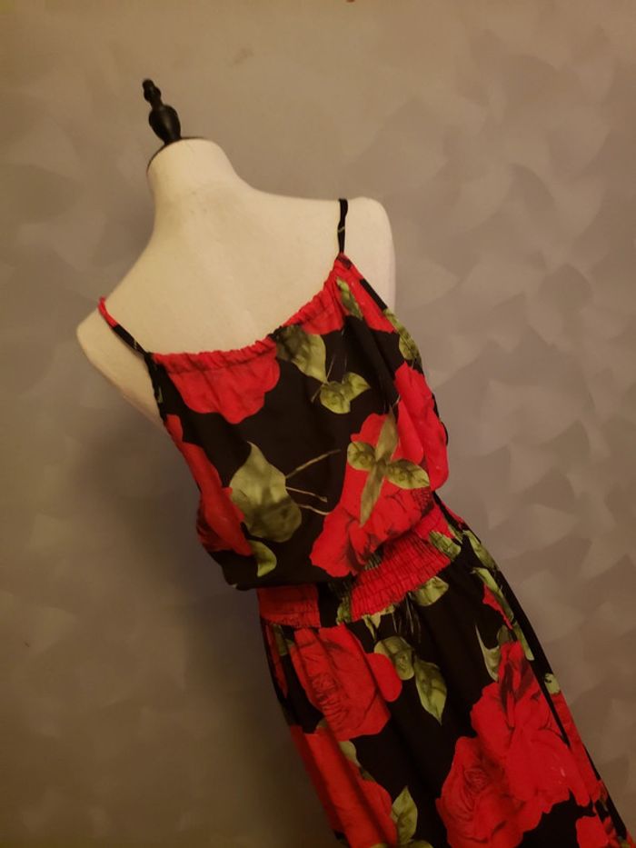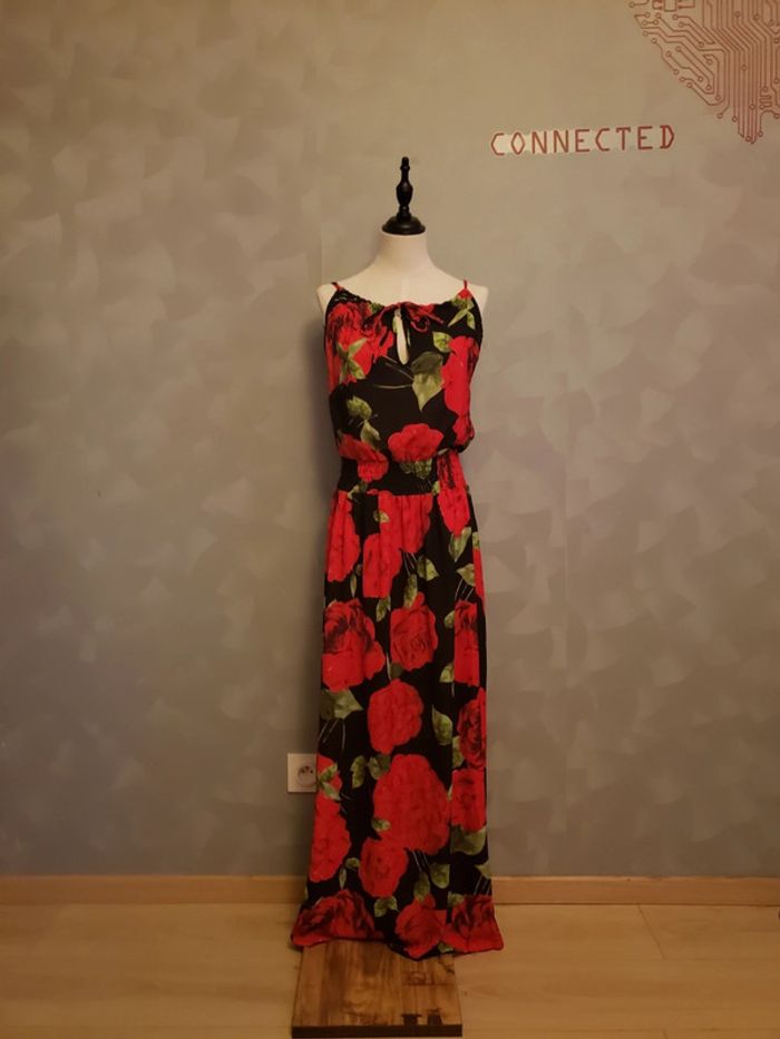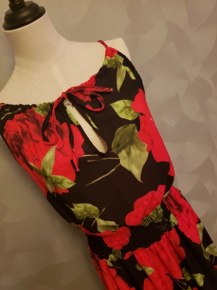 Robe longue 🎀 en parfait état Motifs : roses 🌹 Couleurs : noir, rouge, vert et blanc Noeud a nouer devant (voir photo 2) Cintrée à la taille (voir photo 2) Bretelles non réglables Détails de la robe et du tissu (voir photo 5) Pas de taille indiquée : taille unique Robe 👗 fluide et légère Taille du mannequin : poitrine = 88cm, taille = 64cm, hanches = 83cm ⛔️ Pas de photo porté ⛔️ D’autres vêtements femme taille unique : #clemencecavalierifemmetailleunique