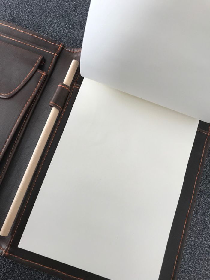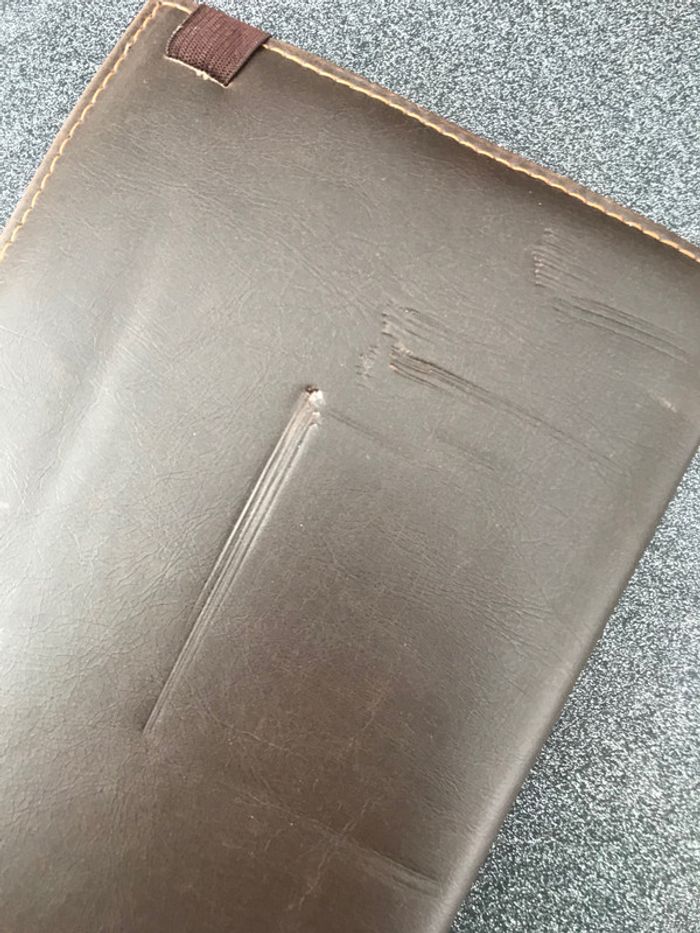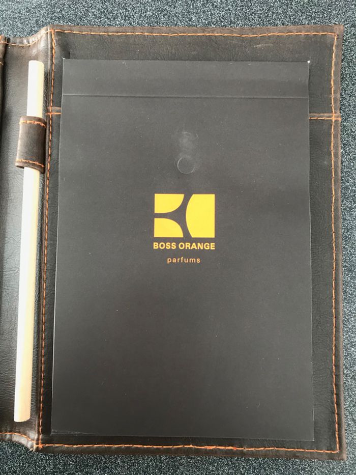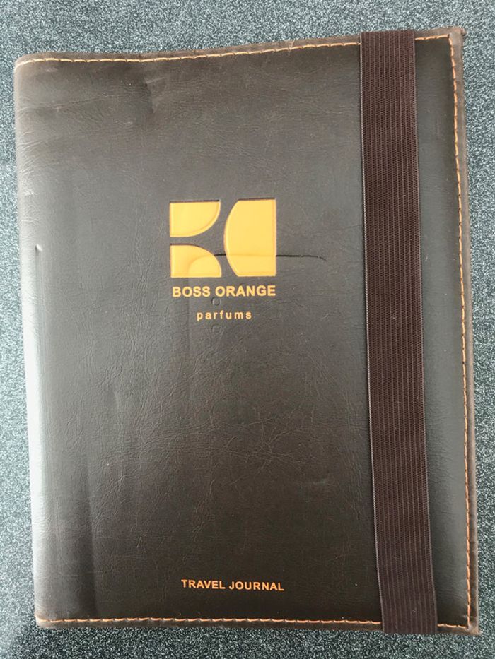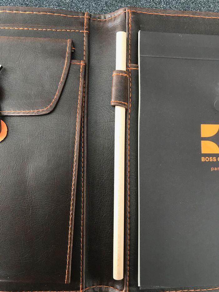 carnet de voyage signé Hugo Boss contenant pochette rangement crayon papier carnet de note fermeture par élastique Attention l'arrière a été griffée voir photo le reste très bon état