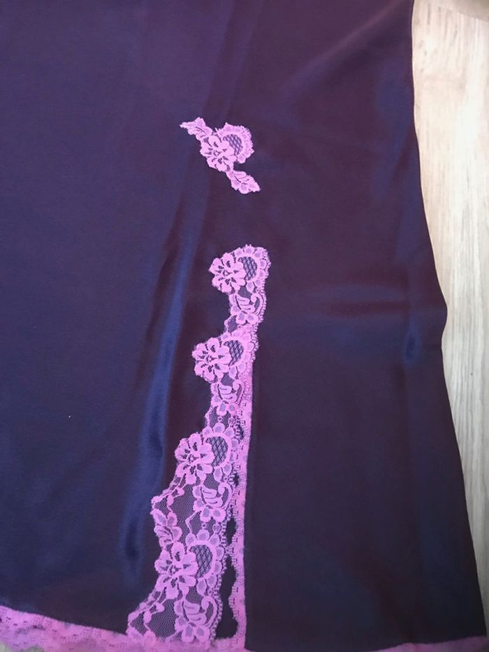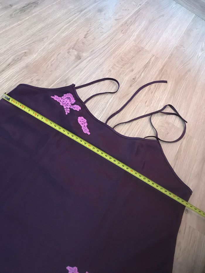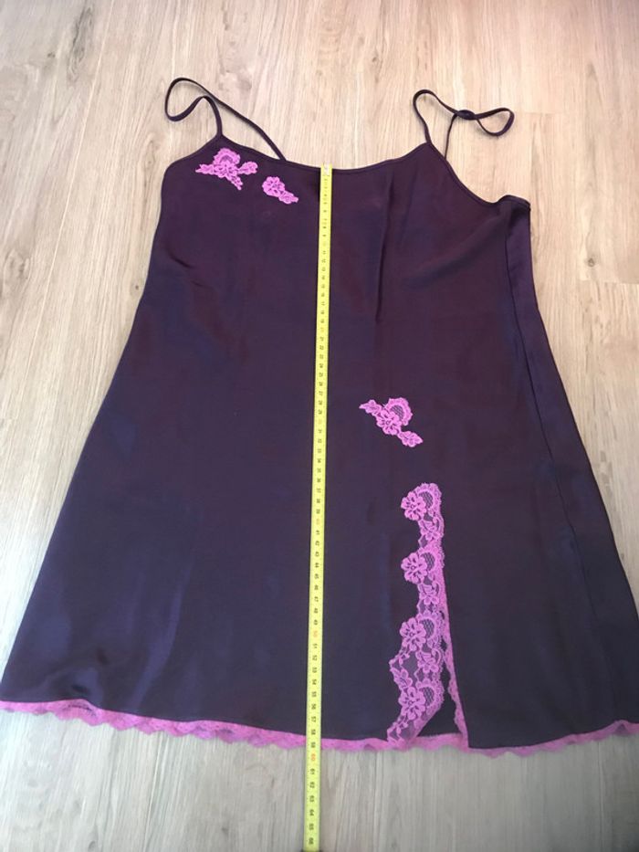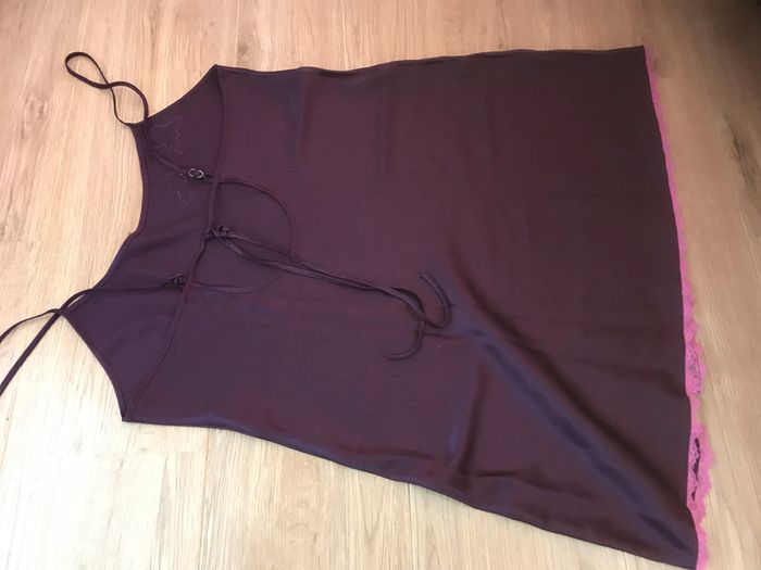 nuisette satin de couleur violine et rose très joli motif fleur rose sur le devant A été porté très peu de fois , l'étiquette a été décousue Taille 40 prévoir plus 38 polyester : toucher satin bretelle réglable noeud au dos Longueur 59cm Taille Aisselle Aisselle 43cm